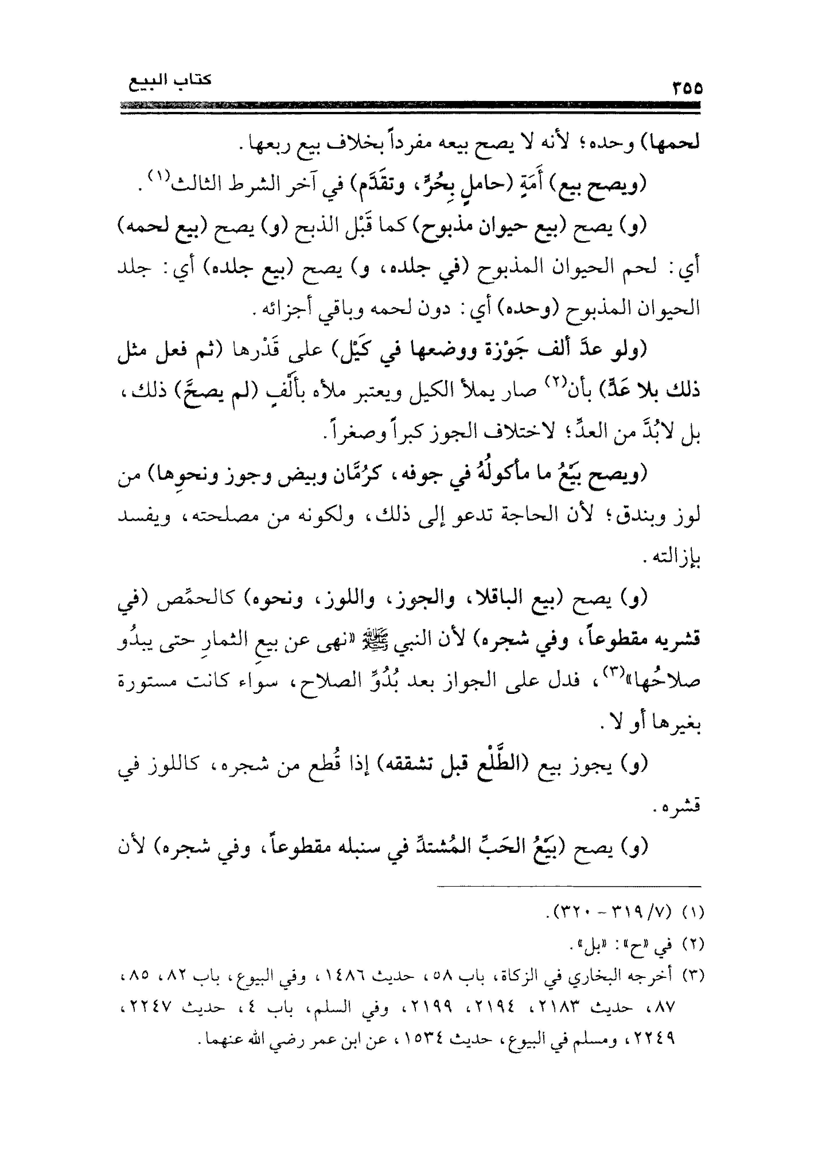 (و) يصح (بيع الباقلا، والجوز، واللوز، ونحوه) كالحمِّص (في قشريه مقطوعًا، وفي شجره) لأن النبي - صلى الله عليه وسلم - "نهى عن بيعِ الثمارِ حتى يبدُو صلاحُها" (¬٣)، فدل على الجواز بعد بُدُوِّ الصلاح، سواء كانت مستورة بغيرها أو لا.