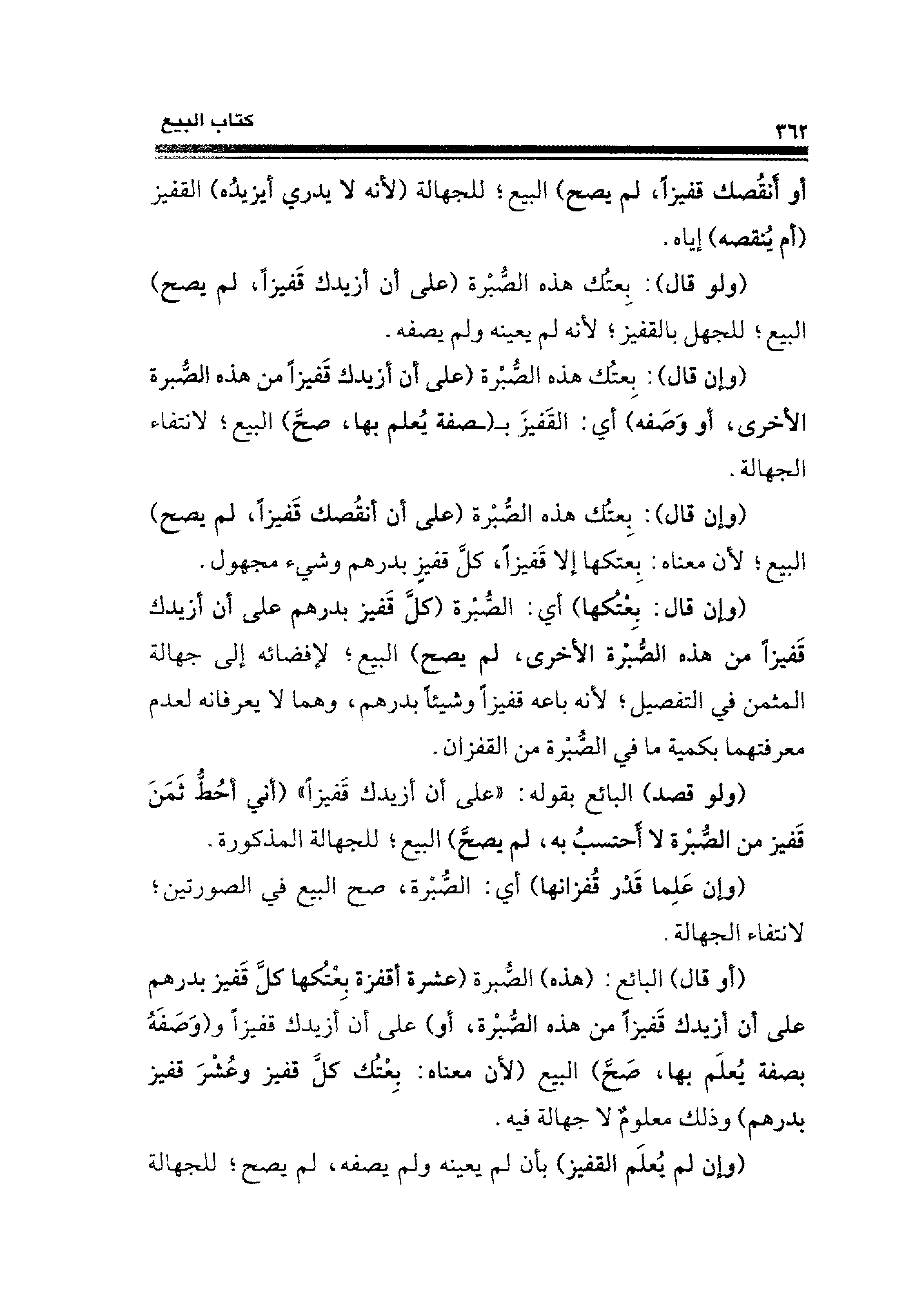 (وإن قال: بَعْتكها) أي: الصُّبرة (كلَّ قَفيز بدرهم على أن أزيدك قَفيزًا من هذه الصُّبرة الأخرى، لم يصح) البيع؛ لإفضائه إلى جهالة المثمن في التفصيل؛ لأنه باعه قفيزًا وشيئًا بدرهم، وهما لا يعرفانه لعدم معرفتهما بكمية ما في الصُّبرة من القفزان.