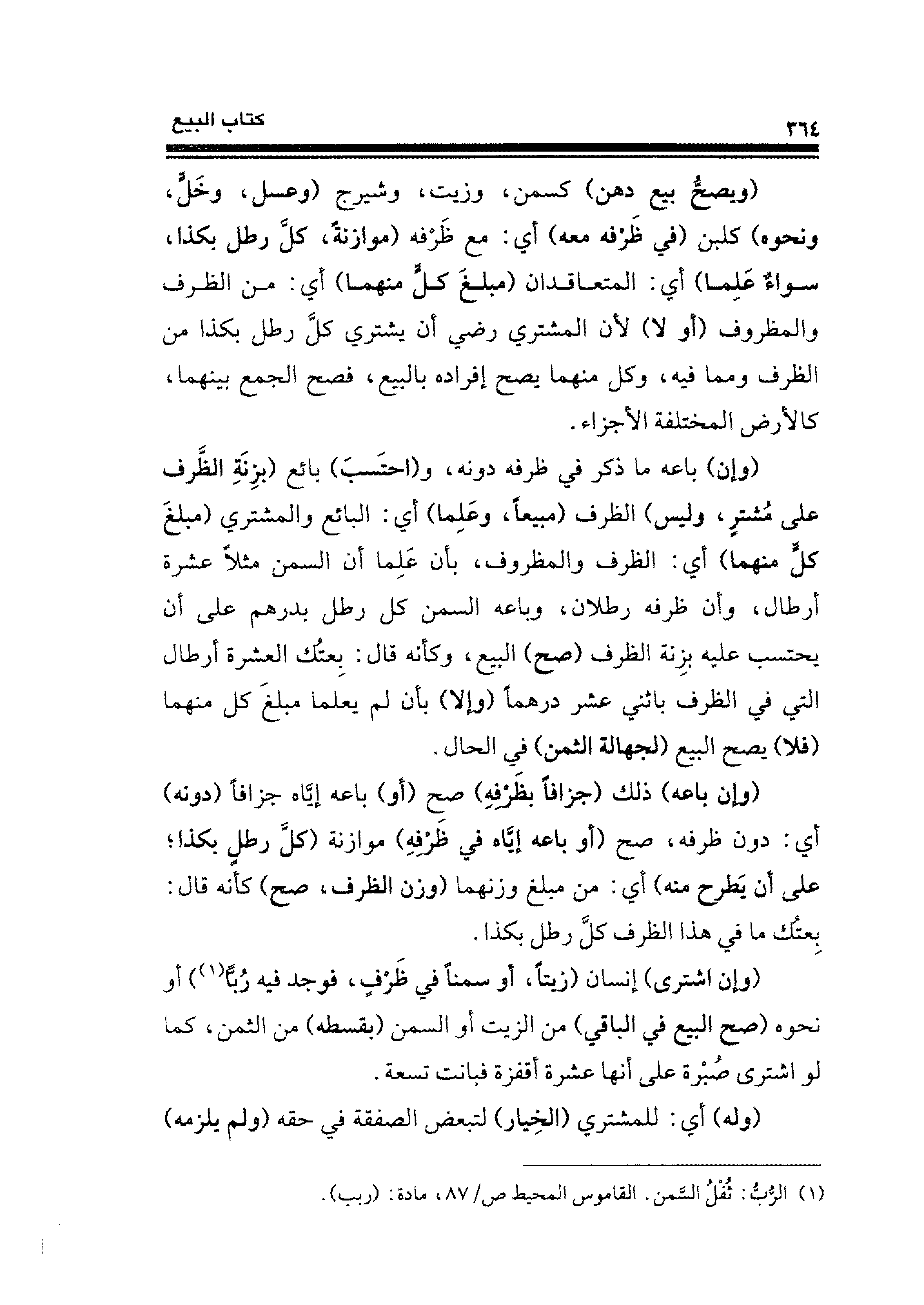 (وإن) باعه ما ذكر في ظرفه دونه، و (احتسبَ) بائع (بزِنَةِ الظَّرف على مُشترٍ، وليس) الظرف (مبيعًا، وعَلِما) أي: البائع والمشتري (مبلغَ كلٍّ منهما) أي: الظرف والمظروف، بأن عَلِما أن السمن مثلًا عشرة أرطال، وأن ظرفه رطلان، وباعه السمن كل رطل بدرهم على أن يحتسب عليه بزِنة الظرف (صح) البيع، وكأنه قال: بِعتك العشرة أرطال التي في الظرف باثني عشر درهمًا (وإلا) بأن لم يعلما مبلغَ كل منهما (فلا) يصح البيع (لجهالة الثمن) فِي الحال.