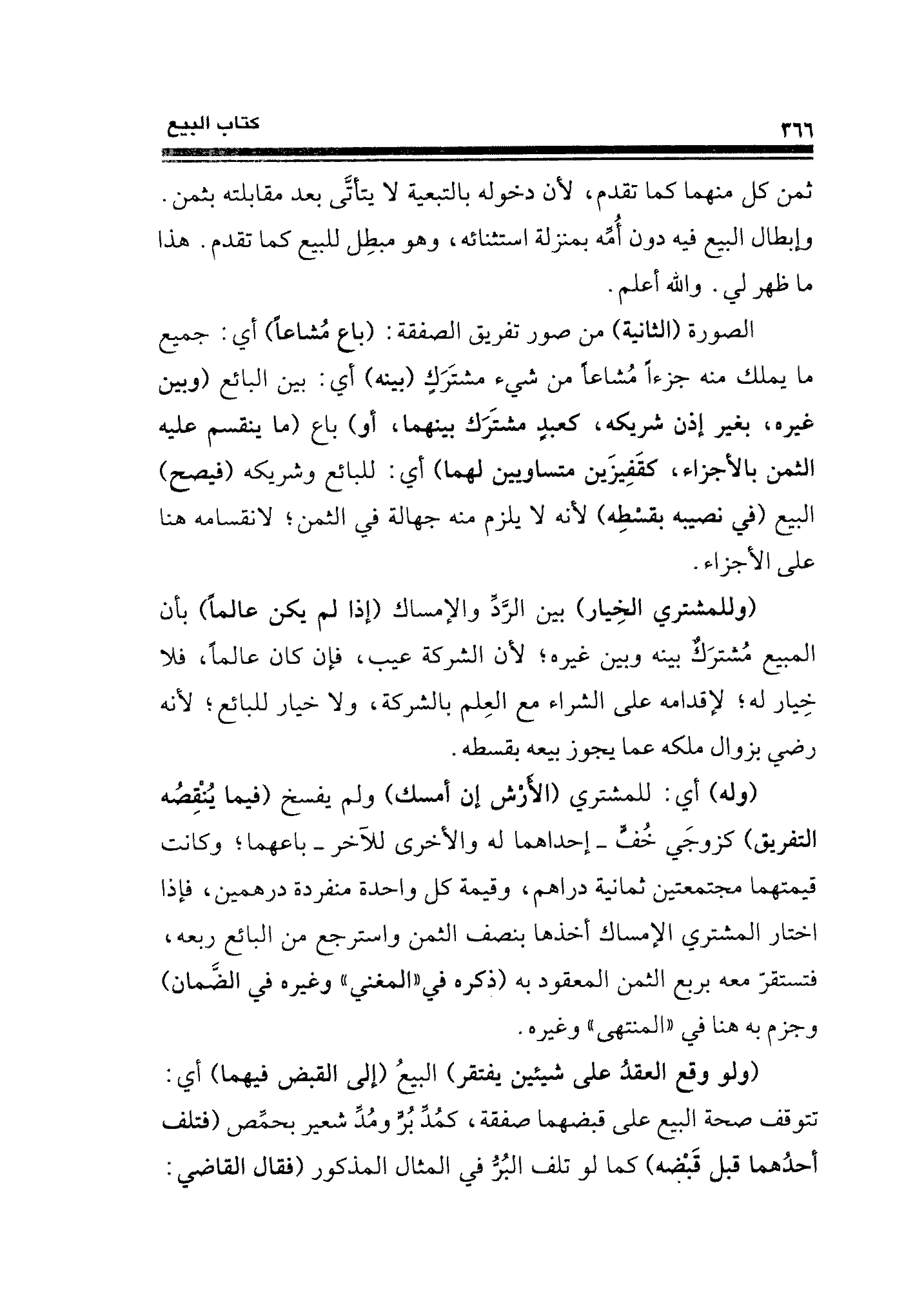 الصورة (الثانية) من صور تفريق الصفقة: (باع مُشاعًا) أي: جميع ما يملك منه جزءًا مُشاعًا من شيء مشترَكٍ (بينه) أي: بين البائع (وبين غيره، بغير إذن شريكه، كعبدٍ مشترك بينهما، أو) باع (ما ينقسم عليه الثمن بالأجزاء، كقَفِيزَين متساويين لهما) أي: للبائع وشريكه (فيصح) البيع (في نصيبه بقسطِه) لأنه لا يلزم منه جهالة في الثمن؛ لانقسامه هنا على الأجزاء.