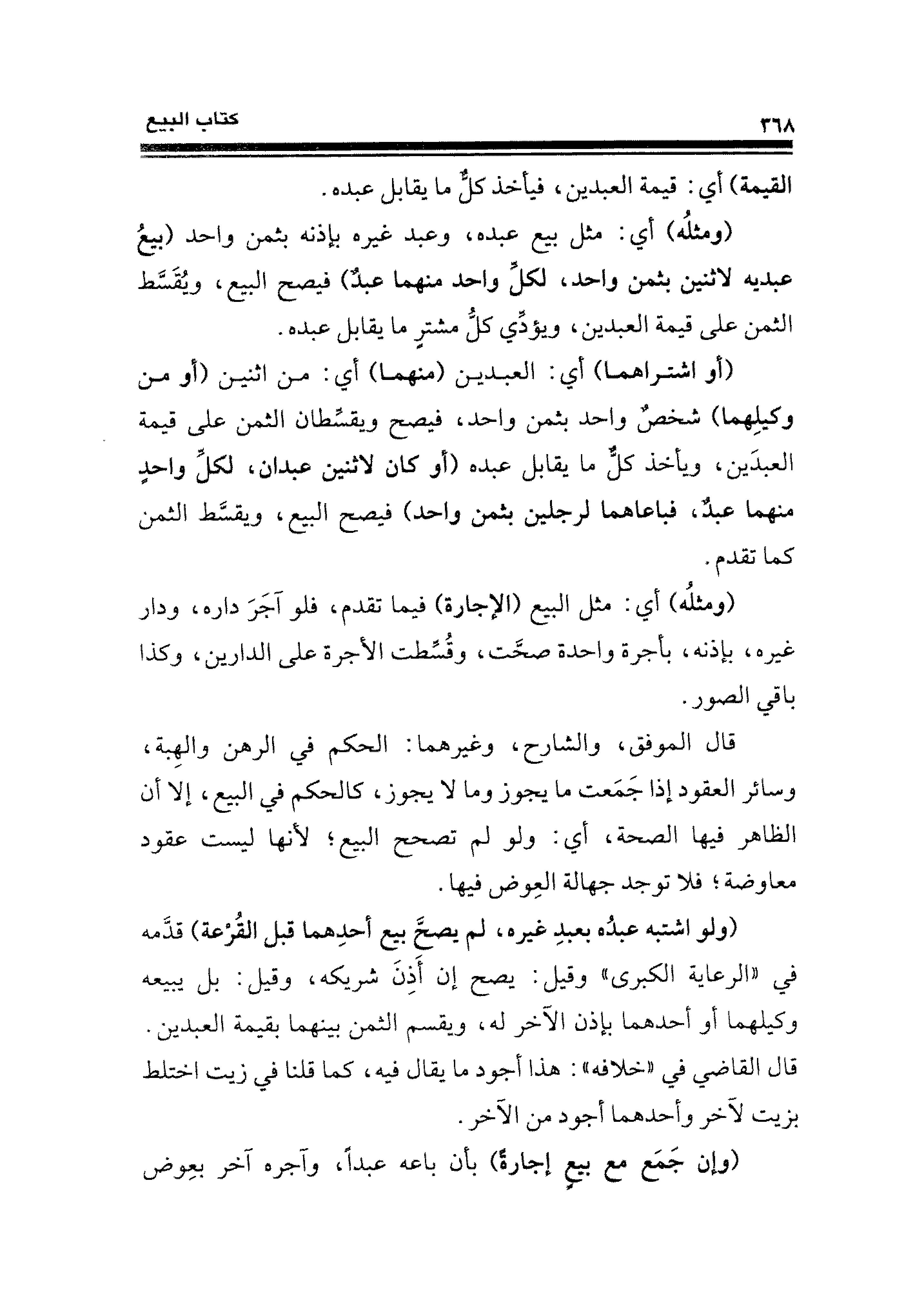 (ومثلُه) أي: مثل بيع عبده، وعبد غيره بإذنه بثمن واحد (بيعُ عبديه لاثنين بثمن واحد، لكلِّ واحد منهما عبدٌ) فيصح البيع، ويُقَسَّط الثمن على قيمة العبدين، ويؤدي كل مشترٍ ما يقابل عبده.