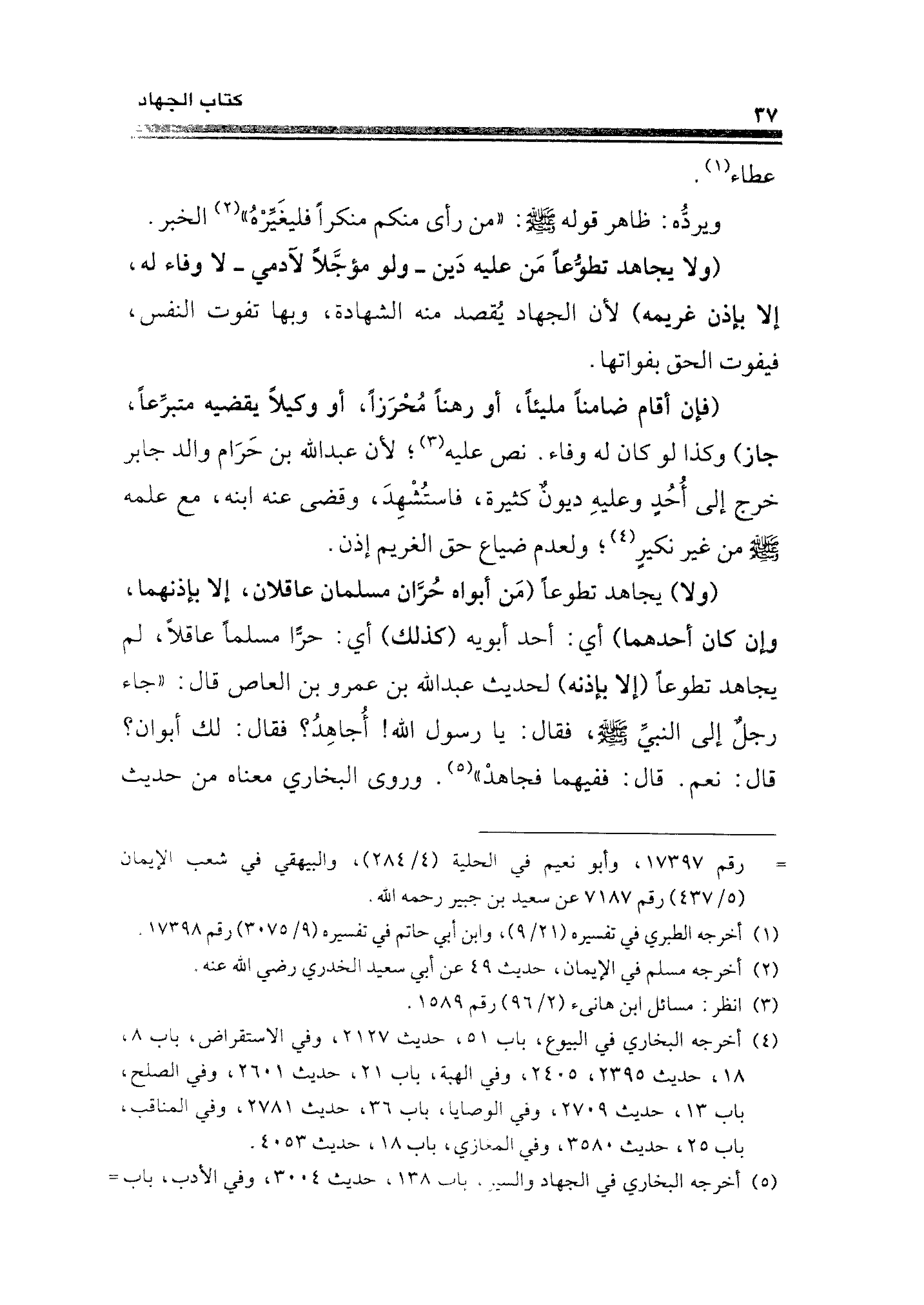 (ولا) يجاهد تطوعًا (مَن أبواه حُرَّان مسلمان عاقلان، إلا بإذنهما، وإن كان أحدهما) أي: أحد أبويه (كذلك) أي: حرًّا مسلمًا عاقلًا، لم يجاهد تطوعًا (إلا بإذنه) لحديث عبد الله بن عمرو بن العاص قال: "جاء رجلٌ إلى النبي - صلى الله عليه وسلم -، فقال: يا رسول الله! أُجاهِدُ؟ فقال: لك أبوان؟ قال: نعم. قال: ففيهما فجاهدْ" (¬٥).