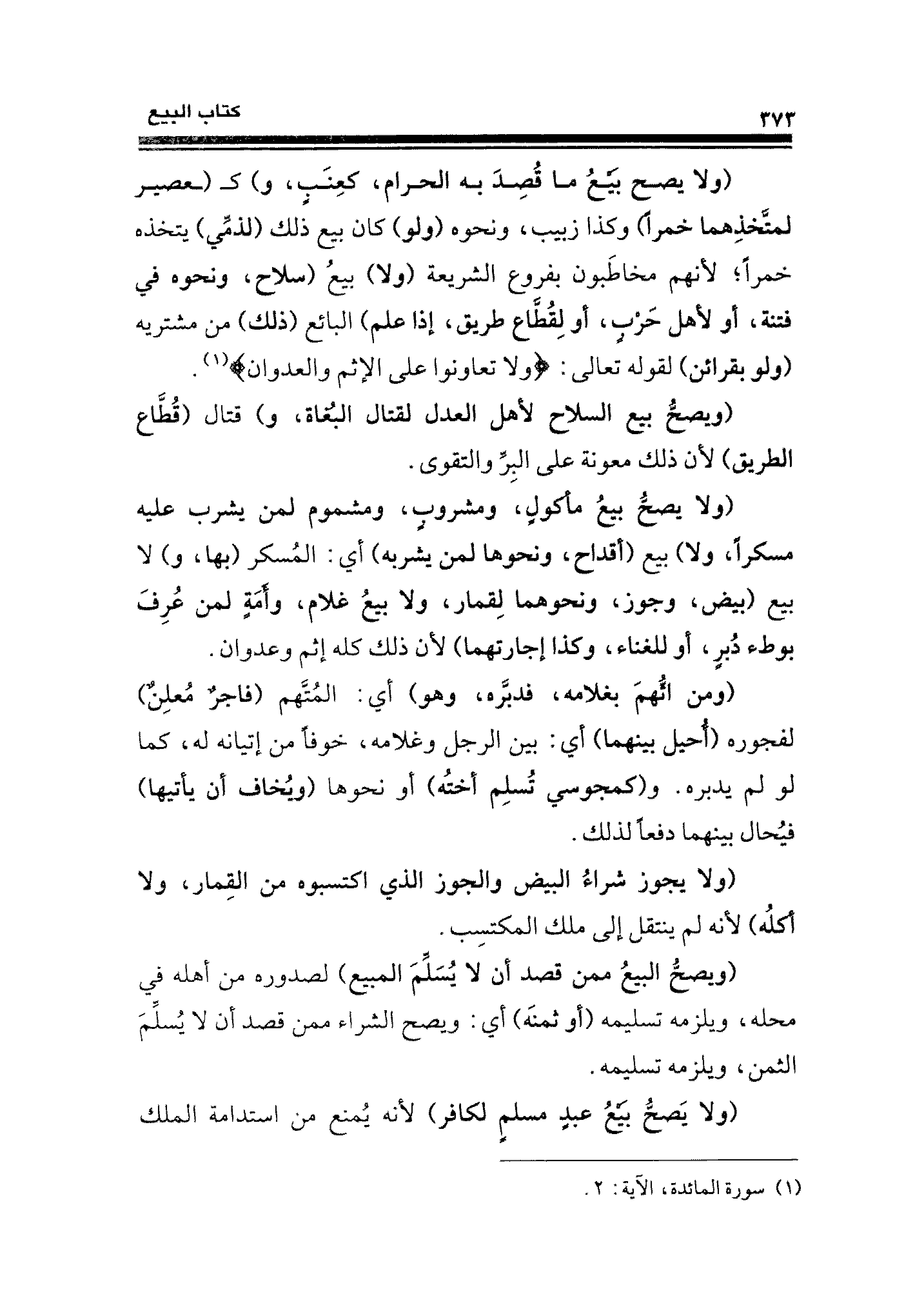 (ولا يصح بَيْعُ ما قُصِدَ به الحرام، كعِنَبٍ و) كـ (ـعصير لمتَّخذِهما خمرًا) وكذا زبيب، ونحوه (ولو) كان بيع ذلك (لذمِّي) يتخذه خمرًا؛ لأنهم مخاطَبون بفروع الشريعة (ولا) بيعُ (سلاح، ونحوه في فتنة، أو لأهل حَربٍ، أو لِقُطَّاع طريق، إذا علم) البائع (ذلك) من مشتريه (ولو بقرائن) لقوله تعالى: {وَلَا تَعَاوَنُوا عَلَى الْإِثْمِ وَالْعُدْوَانِ} (¬١).