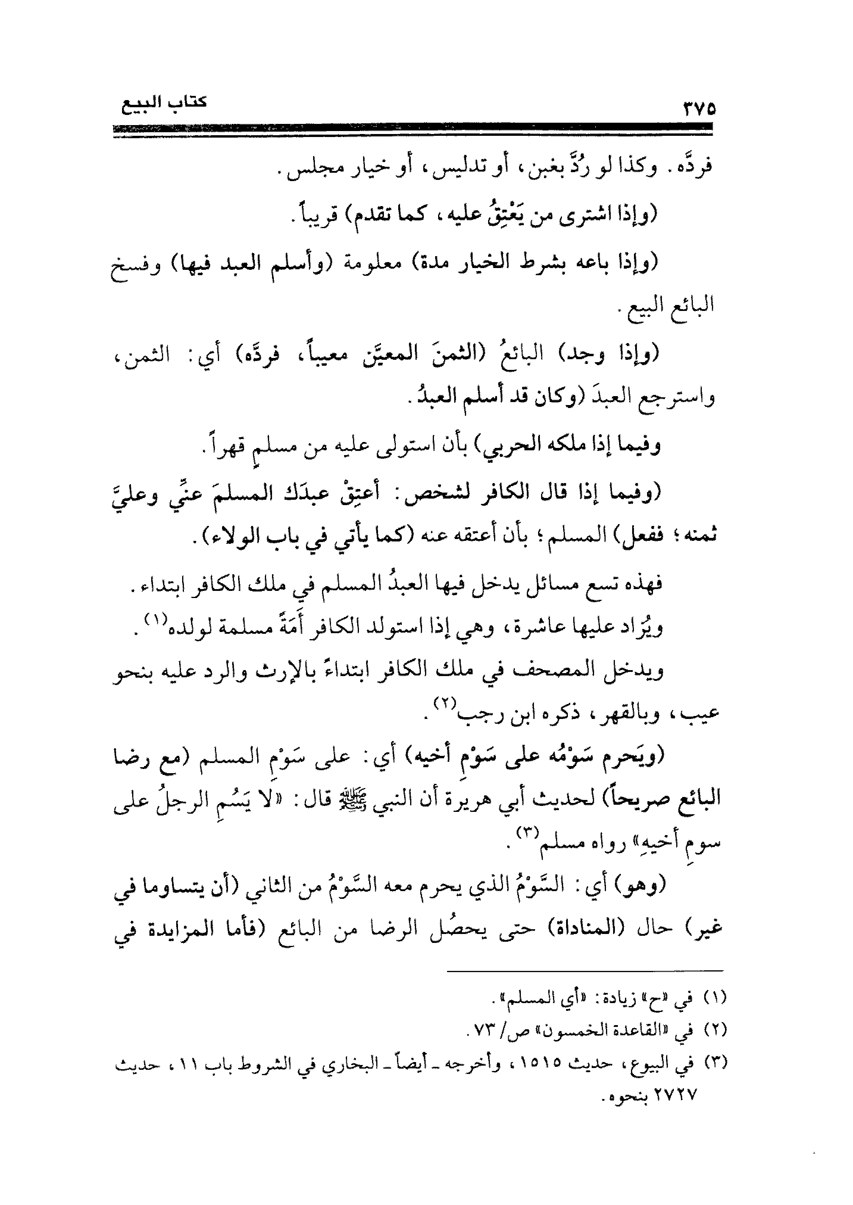 (ويَحرم سَوْمُه على سَوْمِ أخيه) أي: على سَوْمِ المسلم (مع رضا البائع صريحًا) لحديث أبي هريرة أن النبي - صلى الله عليه وسلم - قال: "لا يَسُمِ الرجلُ على سومِ أخْيهِ" رواه مسلم (¬٣).