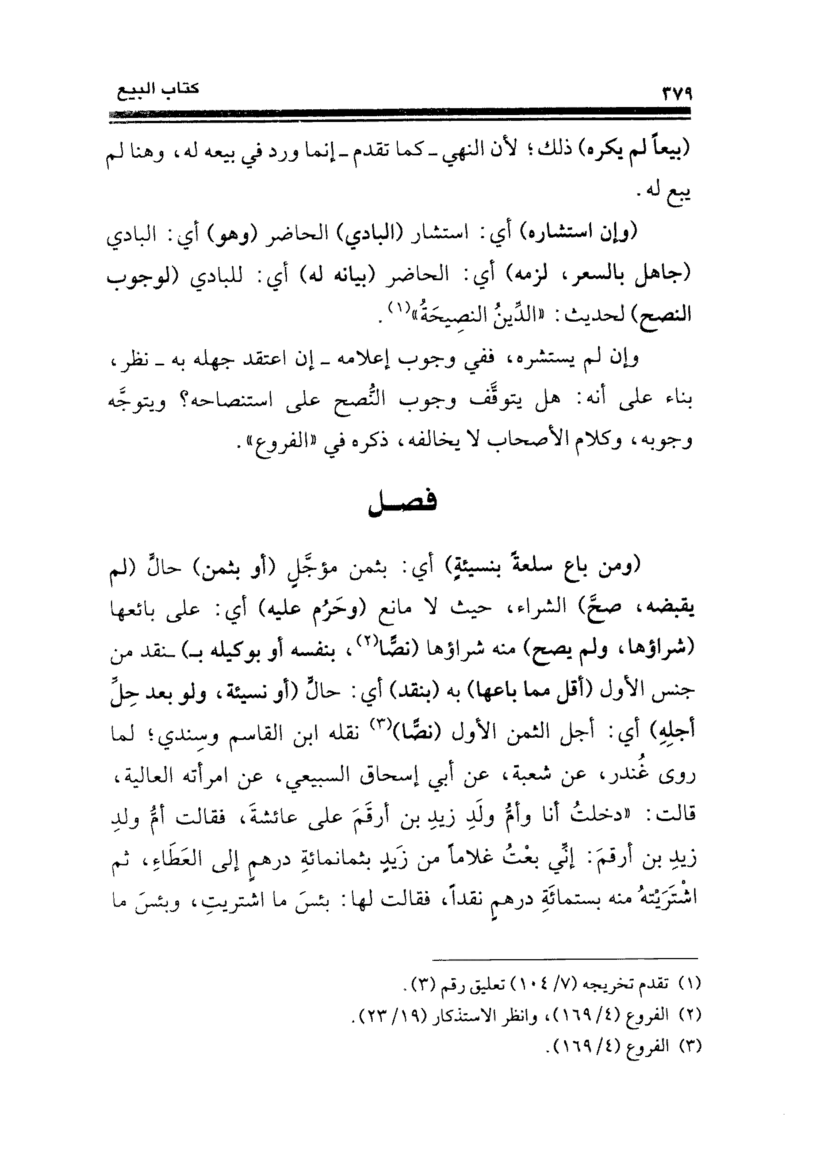 (وإن استشاره) أي: استشار (البادي) الحاضر (وهو) أي: البادي (جاهل بالسعر، لزمه) أي: الحاضر (بيانه له) أي: للبادي (لوجوب النصح) لحديث: "الدِّينُ النصِيحَةُ" (¬١).
