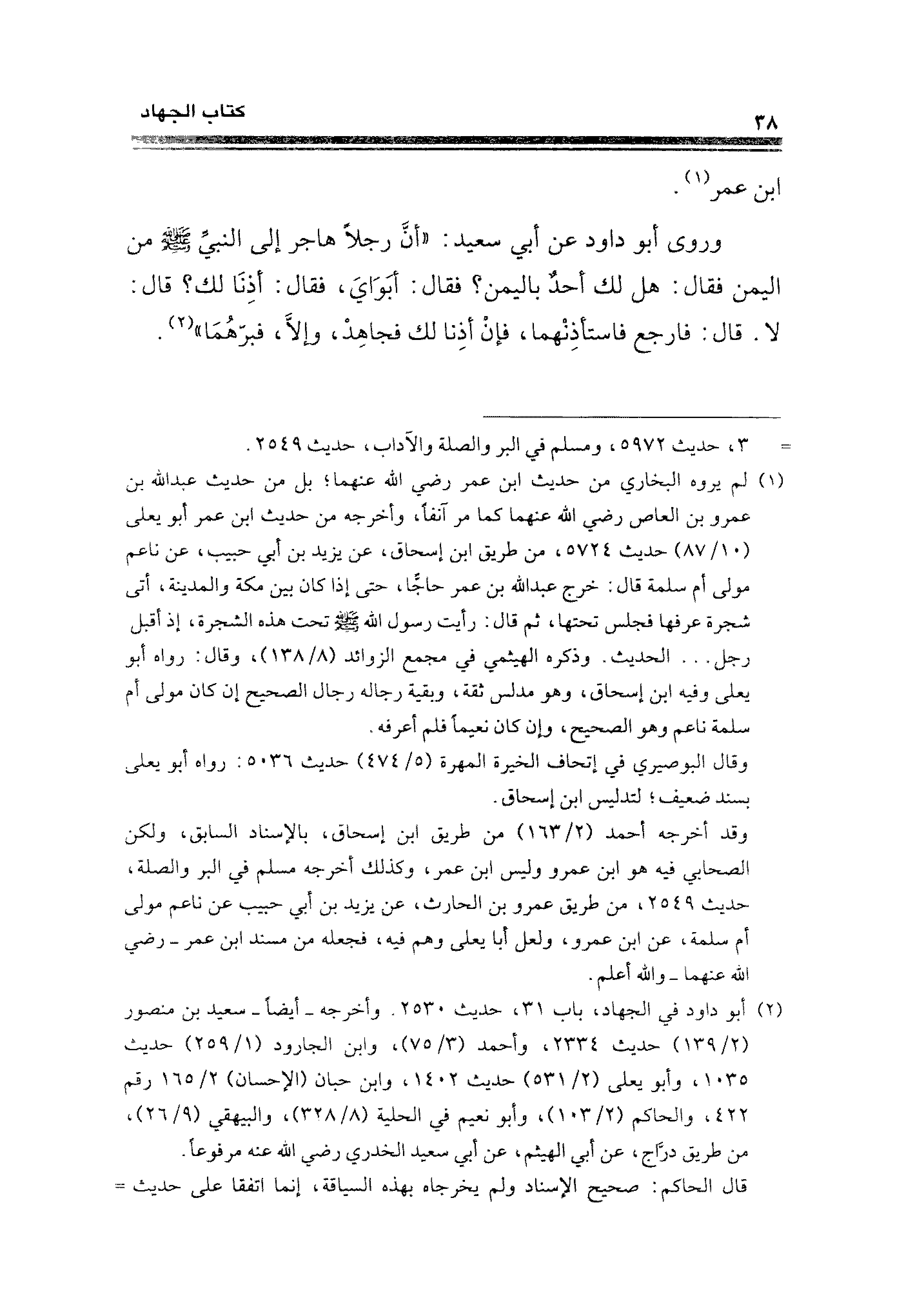 وروى أبو داود عن أبي سعيد: "أنَّ رجلًا هاجر إلى النبي - صلى الله عليه وسلم - من اليمن فقال: هل لك أحدٌ باليمن؟ فقال: أبوايَ، فقال: أذِنَا لك؟ قال: لا. قال: فارجع فاستأذِنْهما، فإنْ أذِنا لك فجاهِد، وإلَّا، فبرّهُمَا" (¬٢).