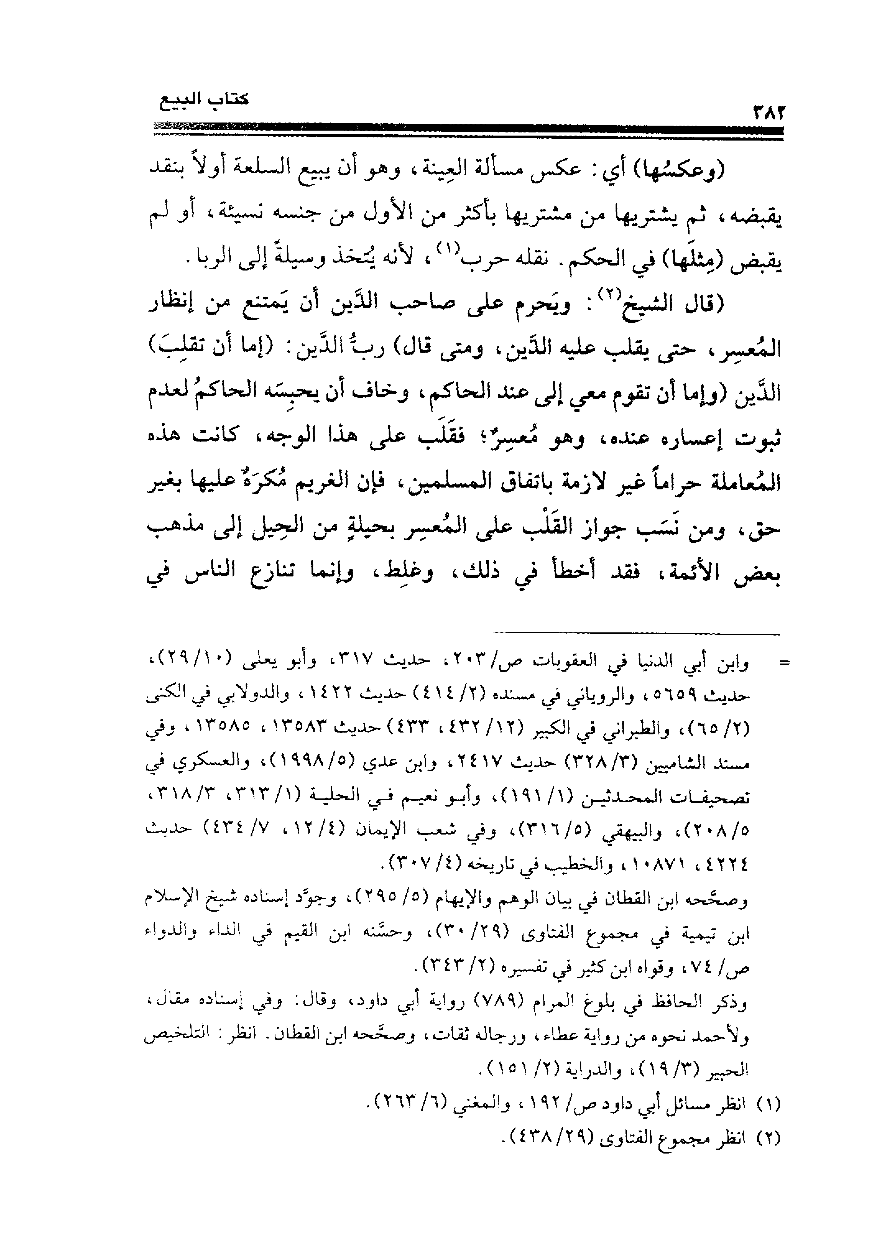 (قال الشيخ (¬٢): ويَحرم على صاحب الدَّين أن يَمتنع من إنظار المُعسِر، حتى يقلب عليه الدَّين، ومتى قال) ربُّ الدَّين: (إما أن تقلِبَ) الدَّين (وإما أن تقوم معي إلى عند الحاكم، وخاف أن يحبِسَه الحاكمُ لعدم ثبوت إعساره عنده، وهو مُعسِرٌ؛ فقَلَب على هذا الوجه، كانت هذه المُعاملة حرامًا غير لازمة باتفاق المسلمين؛ فإن الغريم مُكرَهٌ عليها بغير حق، ومن نَسَب جواز القَلْب على المُعسِر بحيلةٍ من الحِيل إلى مذهب بعض الأئمة، فقد أخطأ في ذلك، وغلِط، وإنما تنازع الناس في