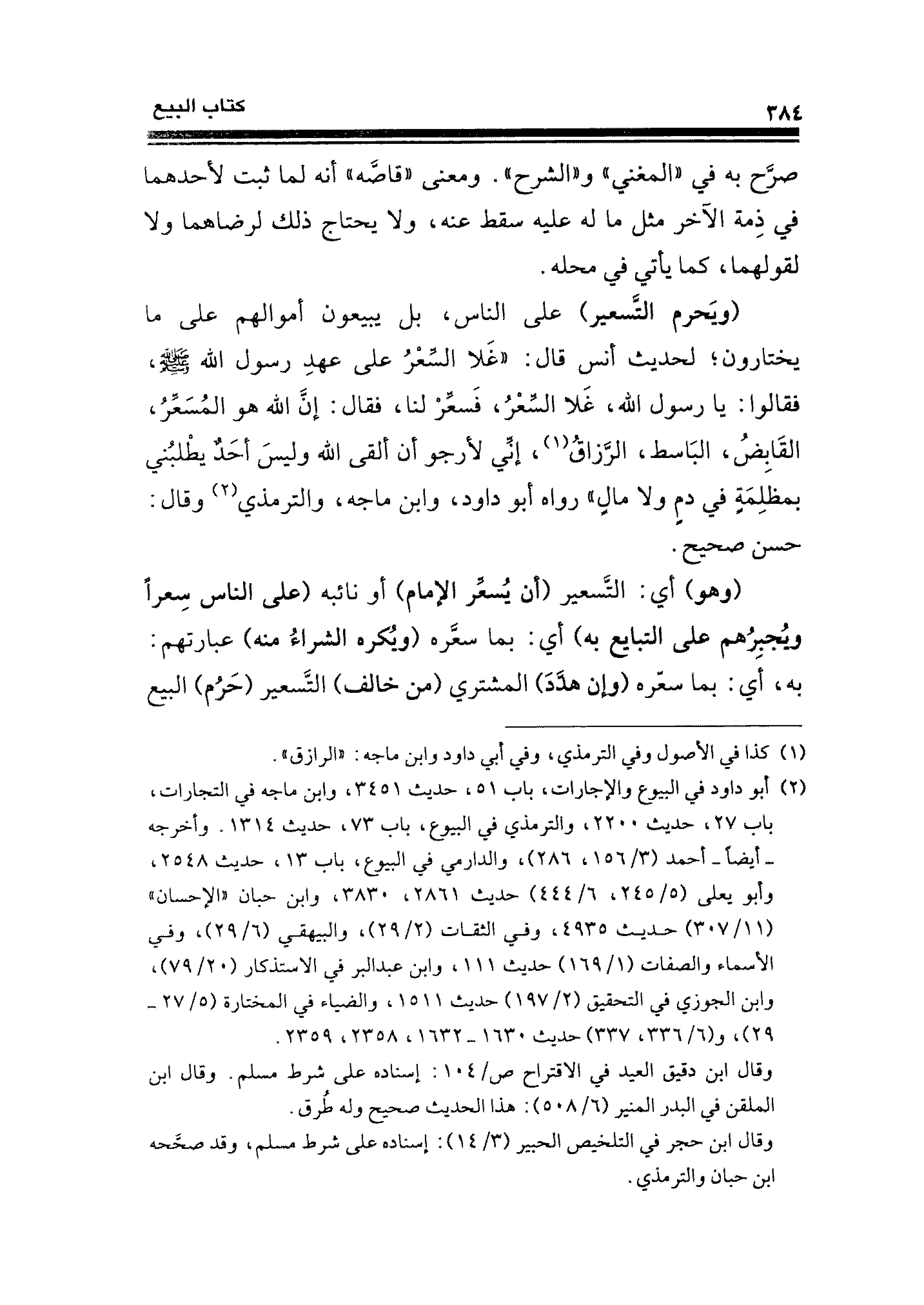 (ويَحرم التَّسعير) على الناس، بل يبيعون أموالهم على ما يختارون؛ لحديث أنس قال: "غَلا السِّعْرُ على عهدِ رسول الله - صلى الله عليه وسلم -، فقالوا: يا رسول الله، غَلا السِّعْرُ، فَسعِّرْ لنا، فقال: إنَّ الله هو المُسَعِّرُ، القَابِضُ، البَاسط، الرَّزاقُ (¬١)، إنِّي لأرجو أن ألقى الله وليسَ أحَدٌ يطْلبُني بمظلِمَةٍ في دمٍ ولا مالٍ" رواه أبو داود، وابن ماجه، والترمذي (¬٢) وقال: حسن صحيح.