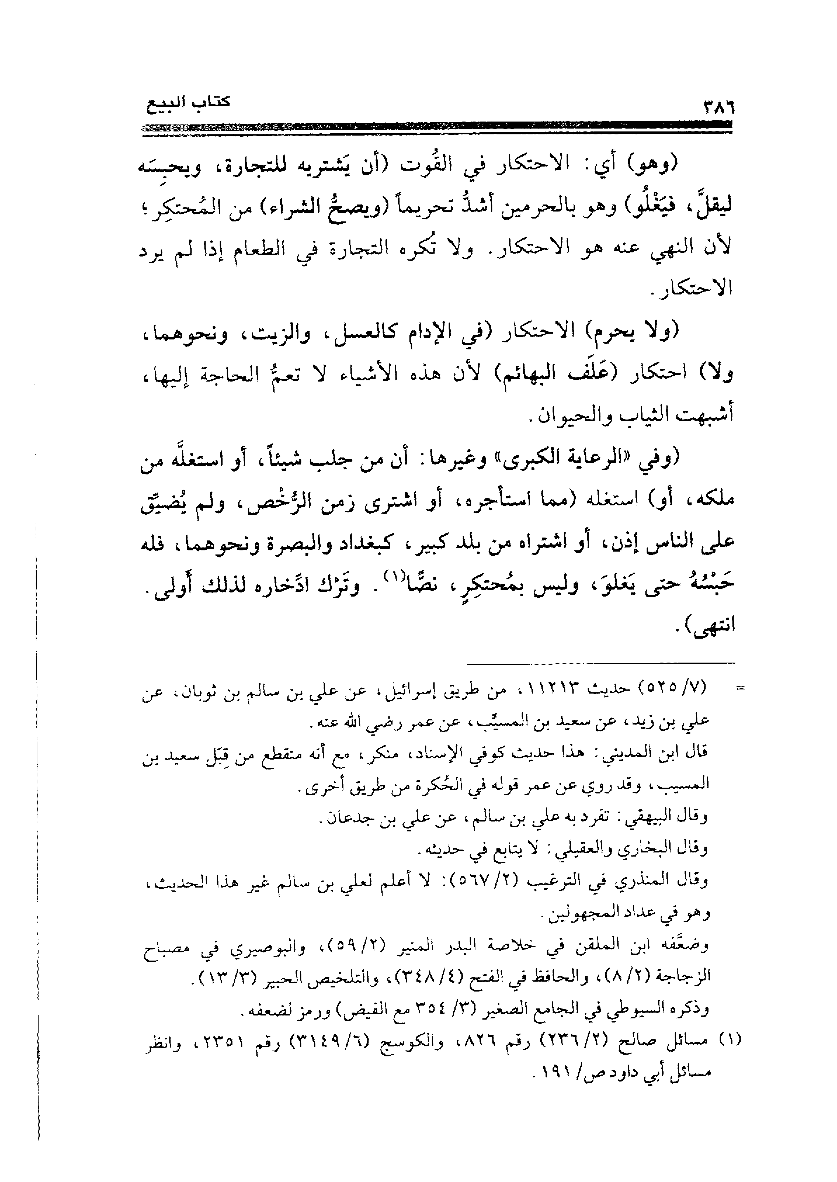 قال ابن المديني: هذا حديث كوفي الإسناد، منكر، مع أنه منقطع من قِبَل سعيد بن المسيب، وقد روي عن عمر قوله في الحُكرة من طريق أخرى.