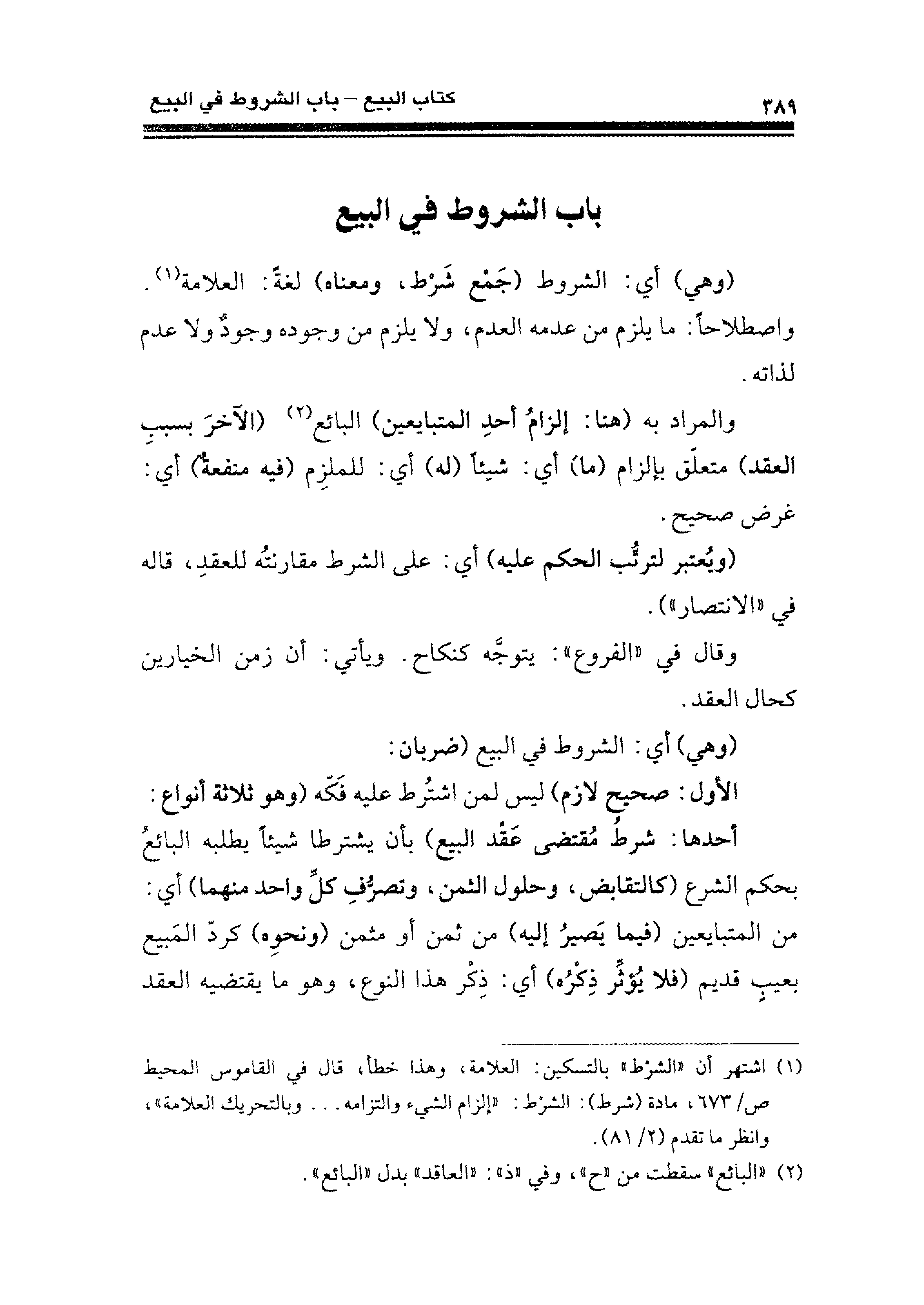 (¬١) اشتهر أن "الشرْط" بالتسكين: العلامة، وهذا خطأ، قال في القاموس المحيط ص / ٦٧٣، مادة (شرط): الشرْط: "إلزام الشيء والتزامه ... وبالتحريك العلامة"، وانظر ما تقدم (٢/ ٨١).