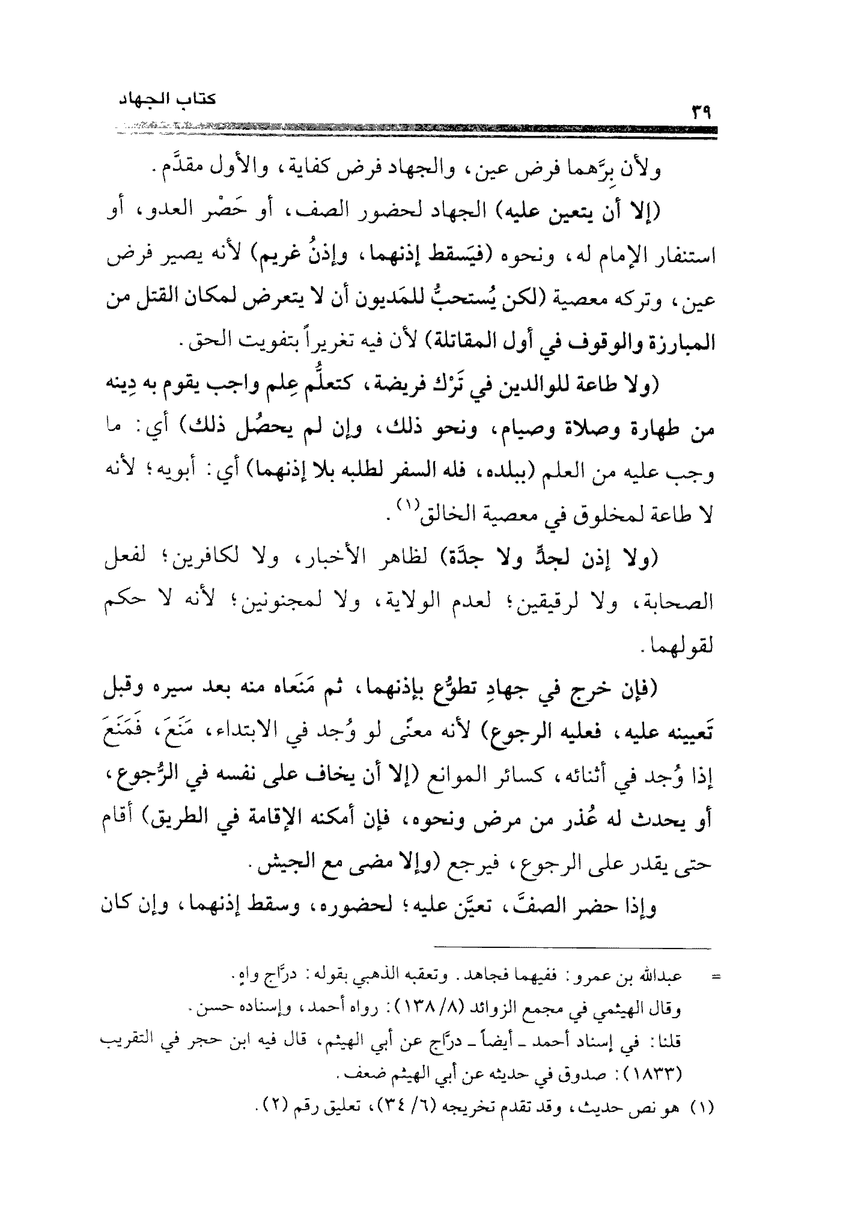 (فإن خرج في جهاد تطوُّع بإذنهما، ثم مَنَعاه منه بعد سيره وقبل تَعيينه عليه، فعليه الرجوع) لأنه معنًى لو وُجد في الابتداء، مَنَعَ، فَمَنَعَ إذا وُجد في أثنائه، كسائر الموانع (إلا أن يخاف على نفسه في الرُّجوع، أو يحدث له عُذر من مرض ونحوه، فإن أمكنه الإقامة فى الطريق) أقام حتى يقدر على الرجوع، فيرجع (وإلا مضى مع الجيش.