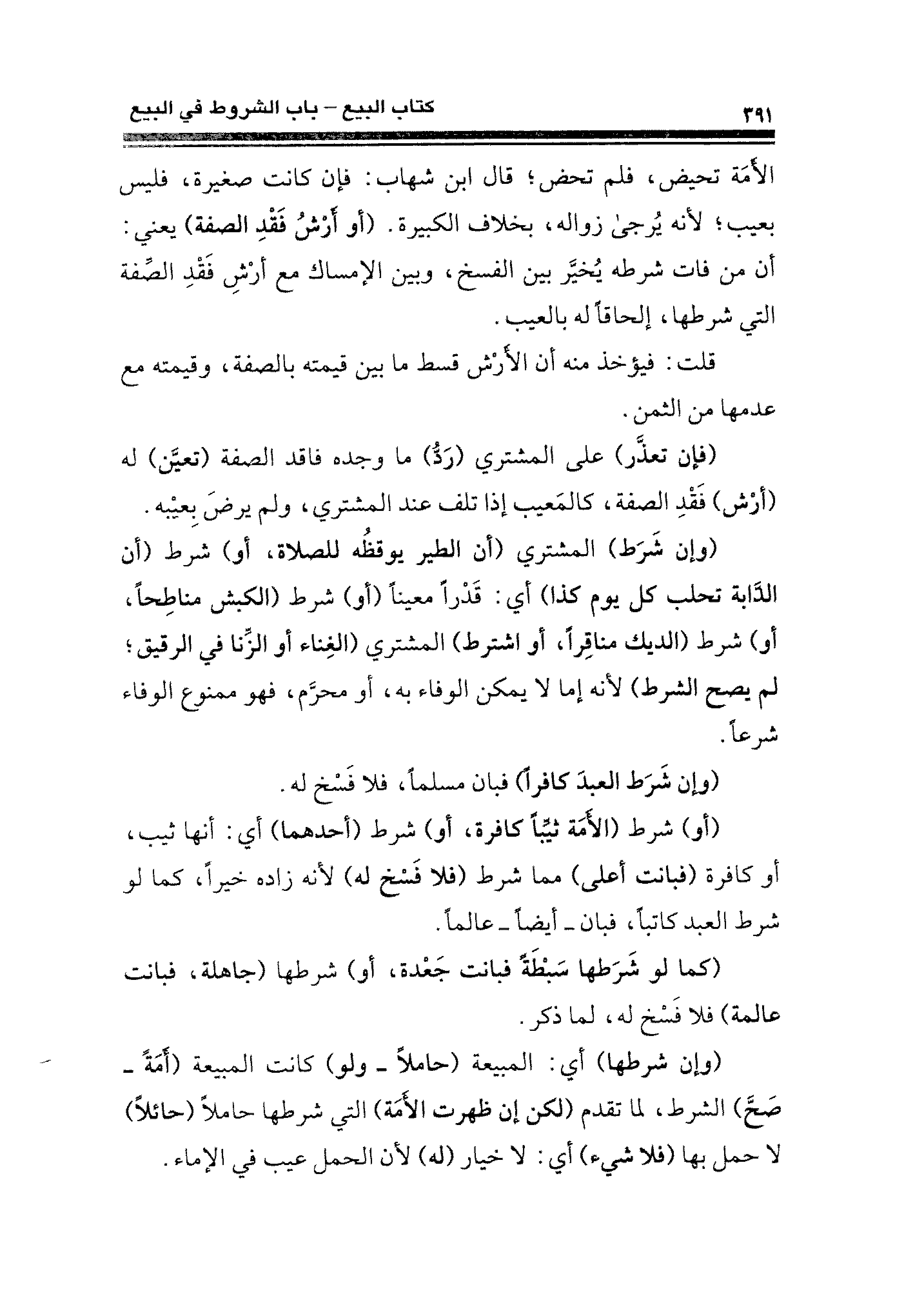 الأَمَهَ تحيض، فلم تحض؛ قال ابن شهاب: فإن كانت صغيرة، فليس بعيب؛ لأنه يُرجى زواله، بخلاف الكبيرة. (أو أَرْشُ فَقْدِ الصفة) يعني: أن من فات شرطه يُخيَّر بين الفسخ، وبين الإمساك مع أرْشِ فَقْدِ الصِّفة التي شرطها، إلحاقًا له بالعيب.