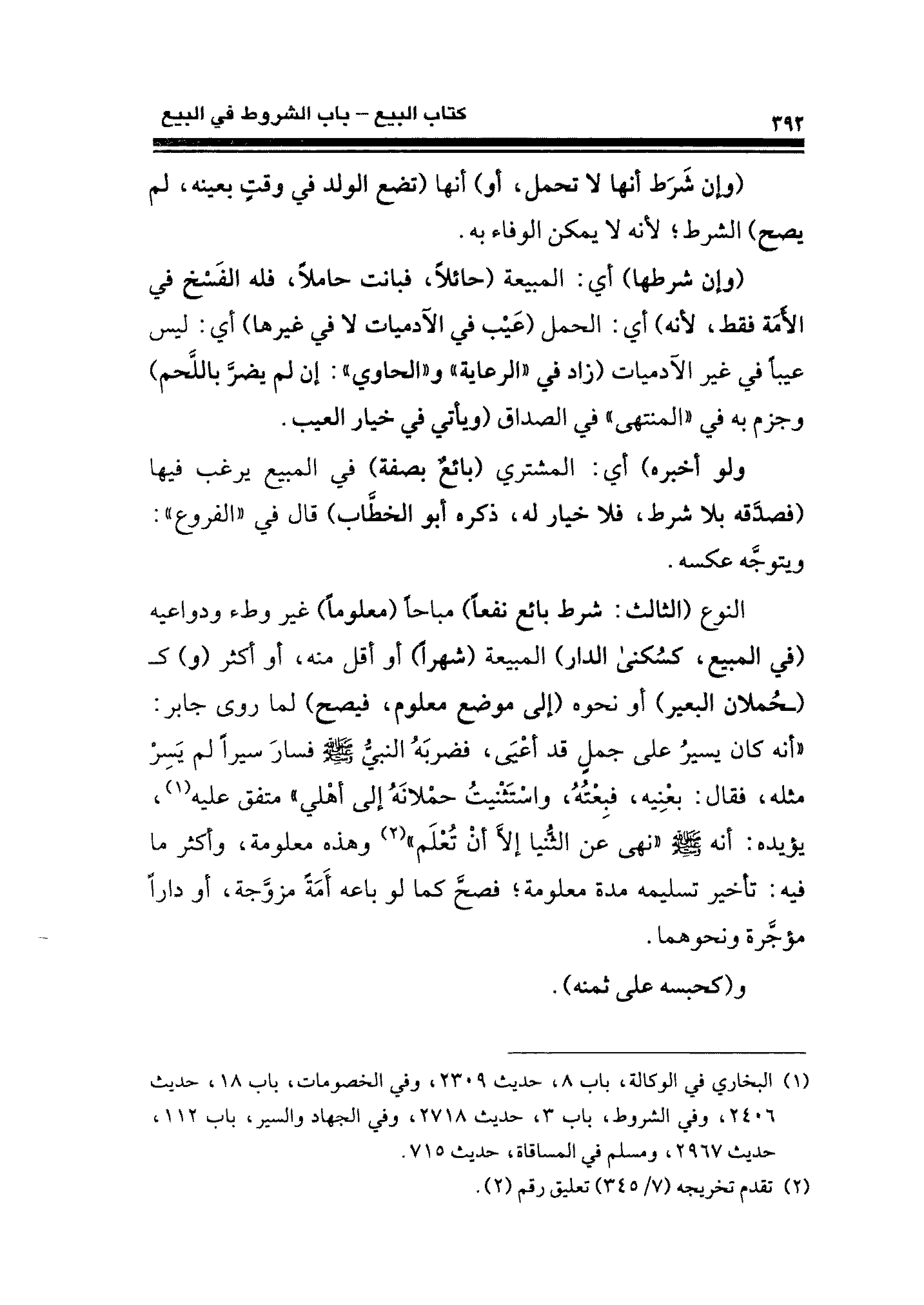 النوع (الثالث: شرط بائع نفعًا) مباحًا (معلومًا) غير وطء ودواعيه (في المبيع، كسُكنى الدار) المبيعة (شهرًا) أو أقل منه، أو أكثر (و) كـ (ـحُملان البعير) أو نحوه (إلى موضع معلوم، فيصح) لما روى جابر: "أنه كان يسيرُ على جملٍ قد أعْيَى، فضربَهُ النبيُّ - صلى الله عليه وسلم - فسارَ سيرًا لم يَسِرْ مثله، فقال: بعْنِيه، فبِعْتُهُ، واستَثنيتُ حمْلانَهُ إلى أهْلي" متفق عليه (¬١)، يؤيده: أنه - صلى الله عليه وسلم - "نهى عن الثُّنيا إلَّا أنْ تُعْلَم" (¬٢) وهذه معلومة، وأكثر ما فيه: تأخير تسليمه مدة معلومة؛ فصحَّ كما لو باعه أَمَةً مزوَّجة، أو دارًا مؤجَّرة ونحوهما.