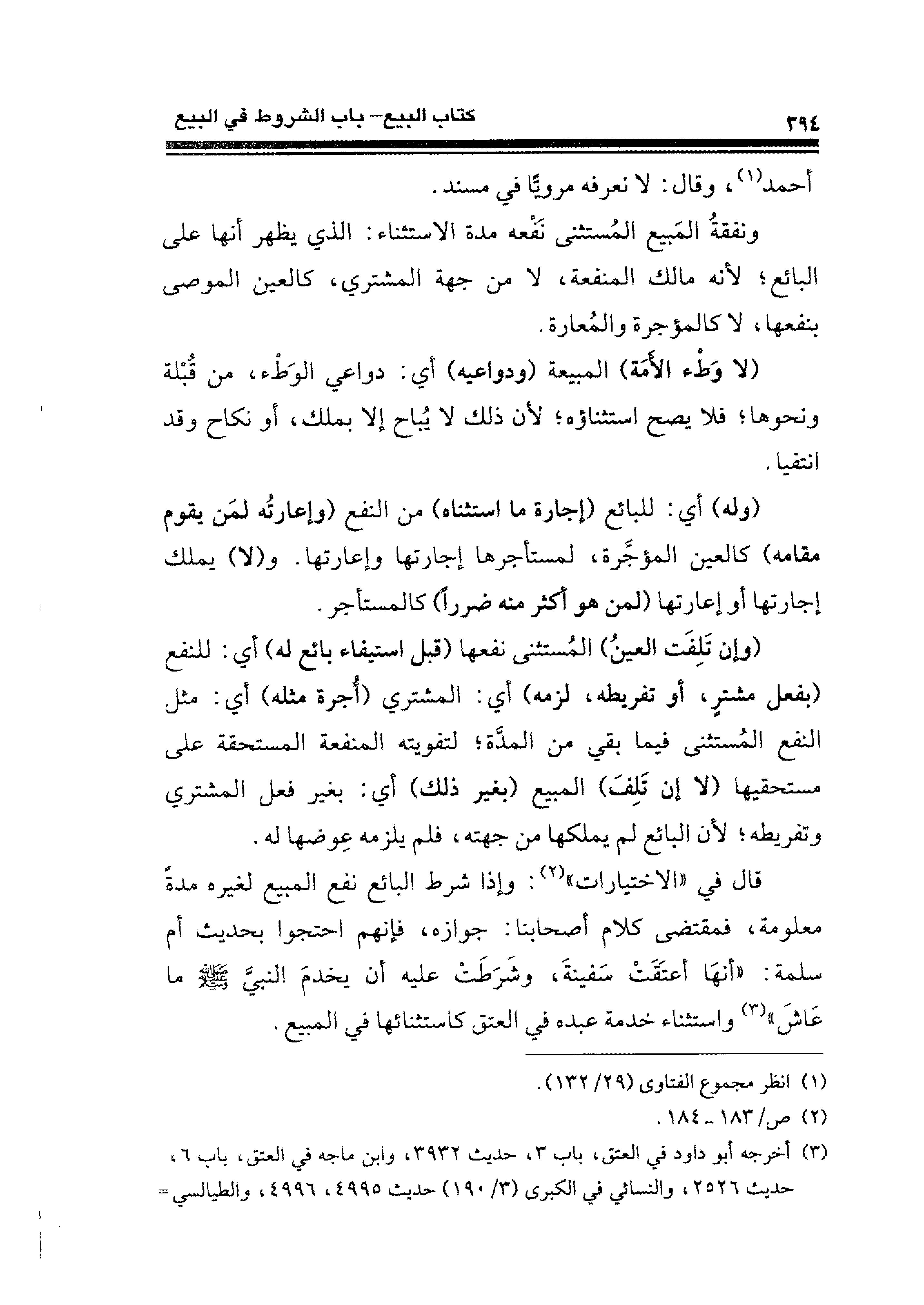 قال في "الاختيارات" (¬٢): وإذا شرط البائع نفع المبيع لغيره مدةً معمومة، فمقتضى كلام أصحابنا: جوازه، فإنهم احتجوا يحديث أم سلمة: "أنهَا أعتَقَتْ سَفينةَ، وشَرَطَتْ عليه أن يخدمَ النبي - صلى الله عليه وسلم - ما عَاشَ" (¬٣) واستثناء خدمة عبده في العتق كاستثنائها في المبيع.