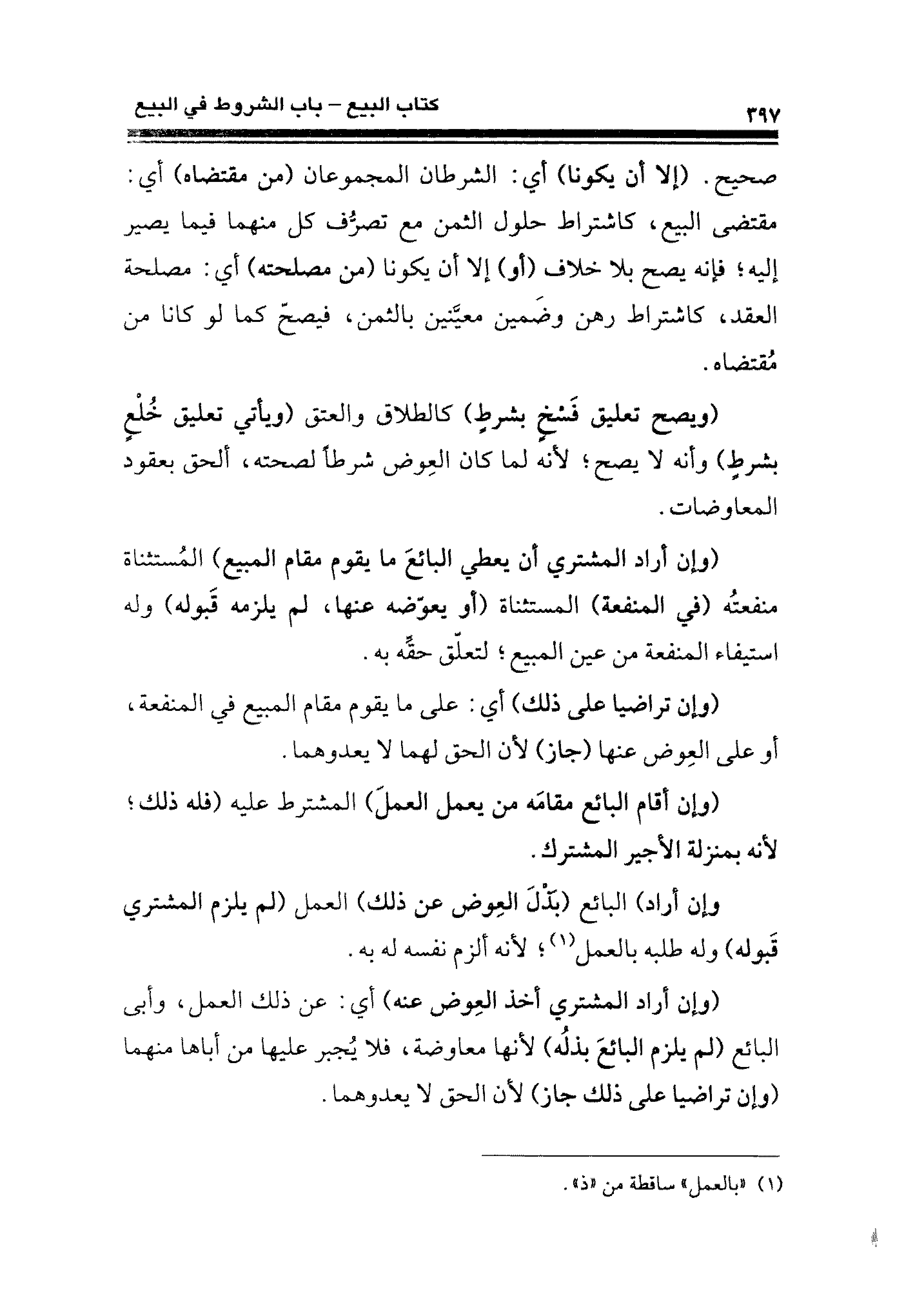 صحيح. (إلَّا أن يكونا) أي: الشرطان المجموعان (من مقتضاه) أي: مقتضى البيع، كاشتراط حلول الثمن مع تصرُّف كل منهما فيما يصير إليه؛ فإنَّه يصح بلا خلاف (أو) إلَّا أن يكونا (من مصلحته) أي: مصلحة العقد، كاشتراط رهن وضَمين معيَّنين بالثَّمن، فيصحّ كما لو كانا من مُقتضاه.