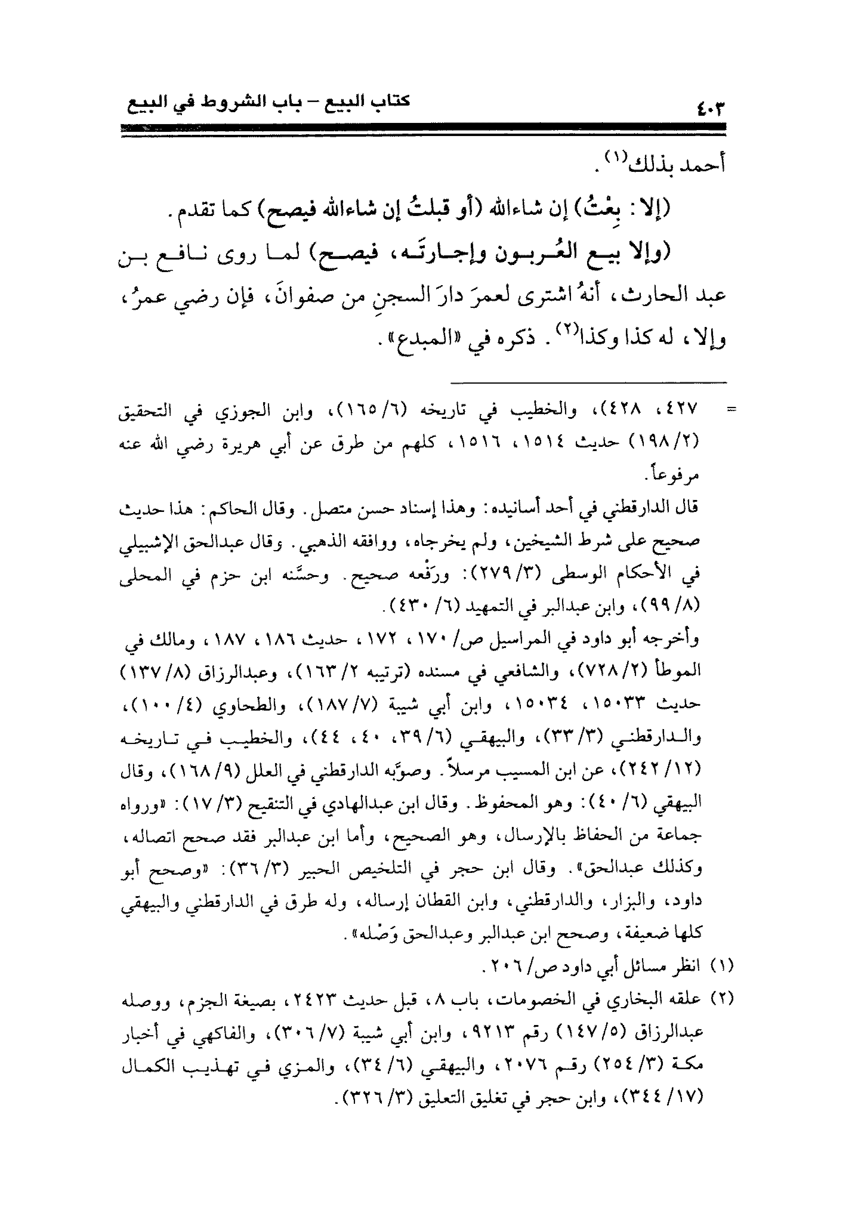 (وإلا بيع العُربون وإجارتَه، فبصح) لما روى نافع بن عبد الحارث، أنهُ اشترى لعمرَ دارَ السجنِ من صفوانَ، فإن رضي عمرُ، وإلا، له كذا وكذا (¬٢). ذكره في "المبدع".