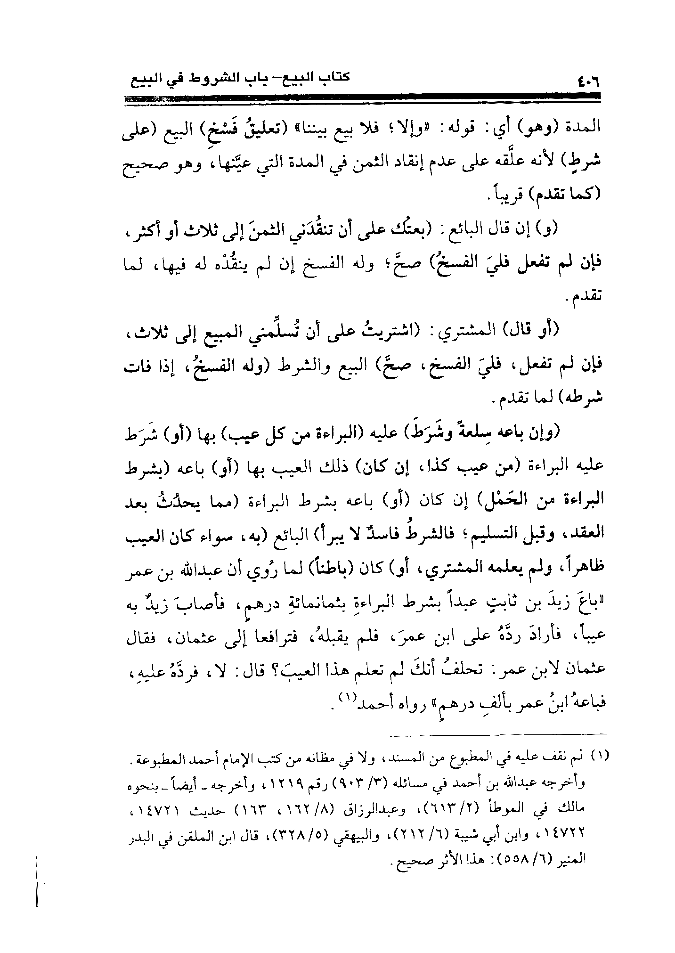 (وإن باعه سِلعةً وشَرَطَ) عليه (البراءة من كل عيب) بها (أو) شَرَط عليه البراءة (من عيب كذا، إن كان) ذلك العيب بها (أو) باعه (بشرط البراءة من الحَمْل) إن كان (أو) باعه بشرط البراءة (مما يحدُثُ بعد العقد، وقبل التسليم؛ فالشرطُ فاسدٌ لا يبرأ) البائع (به، سواء كان العيب ظاهرًا، ولم يعلمه المشتري، أو) كان (باطنًا) لما رُوي أن عبد الله بن عمر "باعَ زيدَ بن ثابتٍ عبدًا بشرط البراءةِ بثمانمائةِ درهمٍ، فأصابَ زيد به عيبًا، فأرادَ ردَّهُ على ابن عمرَ، فلم يقبلهُ، فترافعا إلى عثمان، فقال عثمان لابن عمر: تحلفُ أنكَ لم تعلم هذا العيبَ؟ قال: لا، فردَّهُ عليهِ، فباعهُ ابنُ عمر بألفِ درهمٍ" رواه أحمد (¬١).