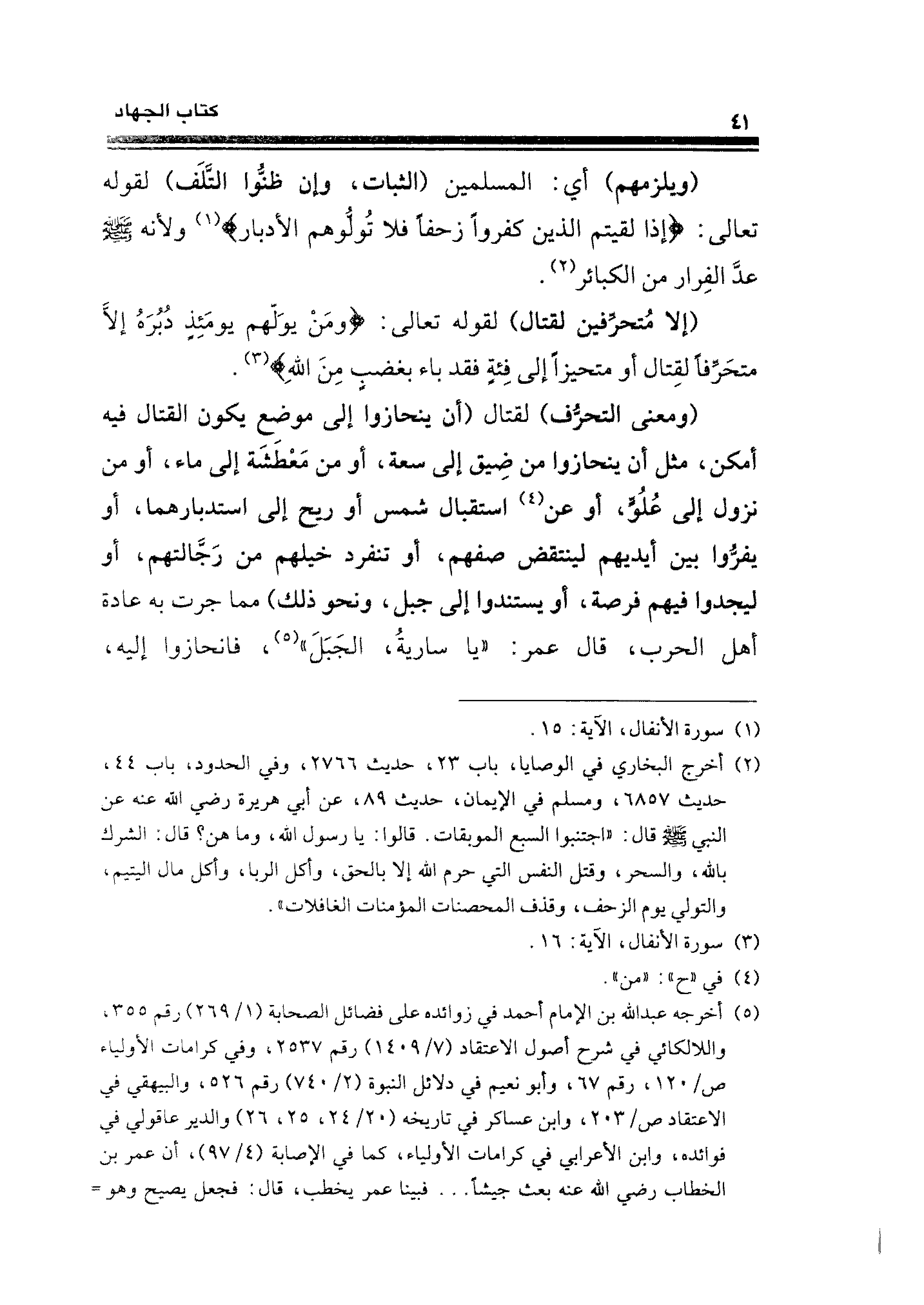 (ومعنى التحرُّف) لقتال (أن ينحازوا إلى موضع يكون القتال في أمكن، مثل أن ينحازوا من ضِيق إلى سعة، أو من مَعطشَة إلى ماء، أو من نزول إلى عُلُوٍ، أو عن (¬٤) استقبال شمس أو ريح إلى استدبارهما، أو يفرُّوا بين أيديهم لينتقض صفهم، أو تفرد خيلهم من رَجَّالتهم، أو ليجدوا فيهم فرصة، أو يستندوا إلى جبل، ونحو ذلك) مما جرت به عادة أهل الحرب، قال عمر: "يا سارية، الجَبَلَ" (¬٥)، فانحازوا إليه،