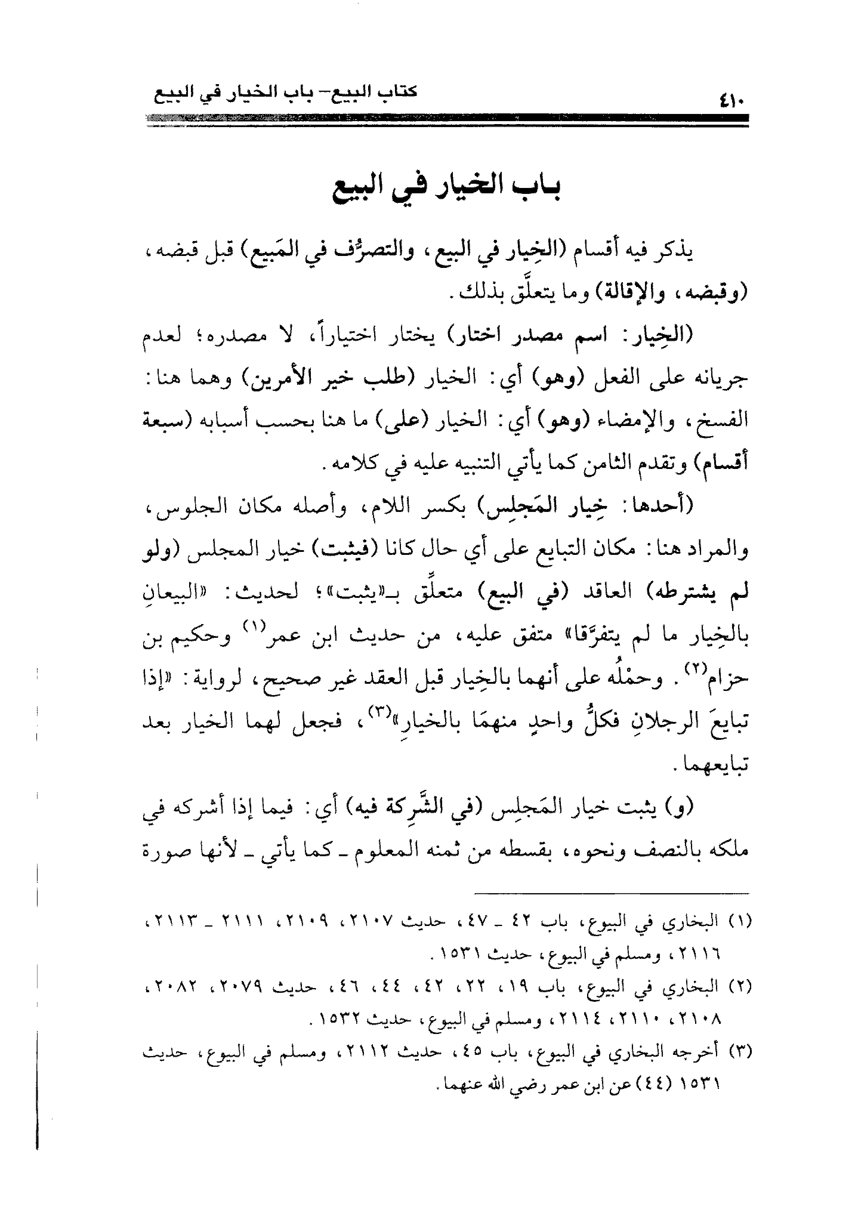 (أحدها: خِيار المَجلِس) بكسر اللام، وأصله مكان الجلوس، والمراد هنا: مكان التبايع على أي حال كانا (فيثبت) خيار المجلس (ولو لم يشترطه) العاقد (في البيع) متعلِّق بـ "يثبت"؛ لحديث: "البيعانِ بالخِيار ما لم يتفرَّقا" متفق عليه، من حديث ابن عمر (¬١) وحكيم بن حزام (¬٢). وحمْلُه على أنهما بالخِيار قبل العقد غير صحيح، لرواية: "إذا تبايعَ الرجلانِ فكلُّ واحدٍ منهمَا بالخيارِ" (¬٣)، فجعل لهدا الخيار بعد تبايعهما.