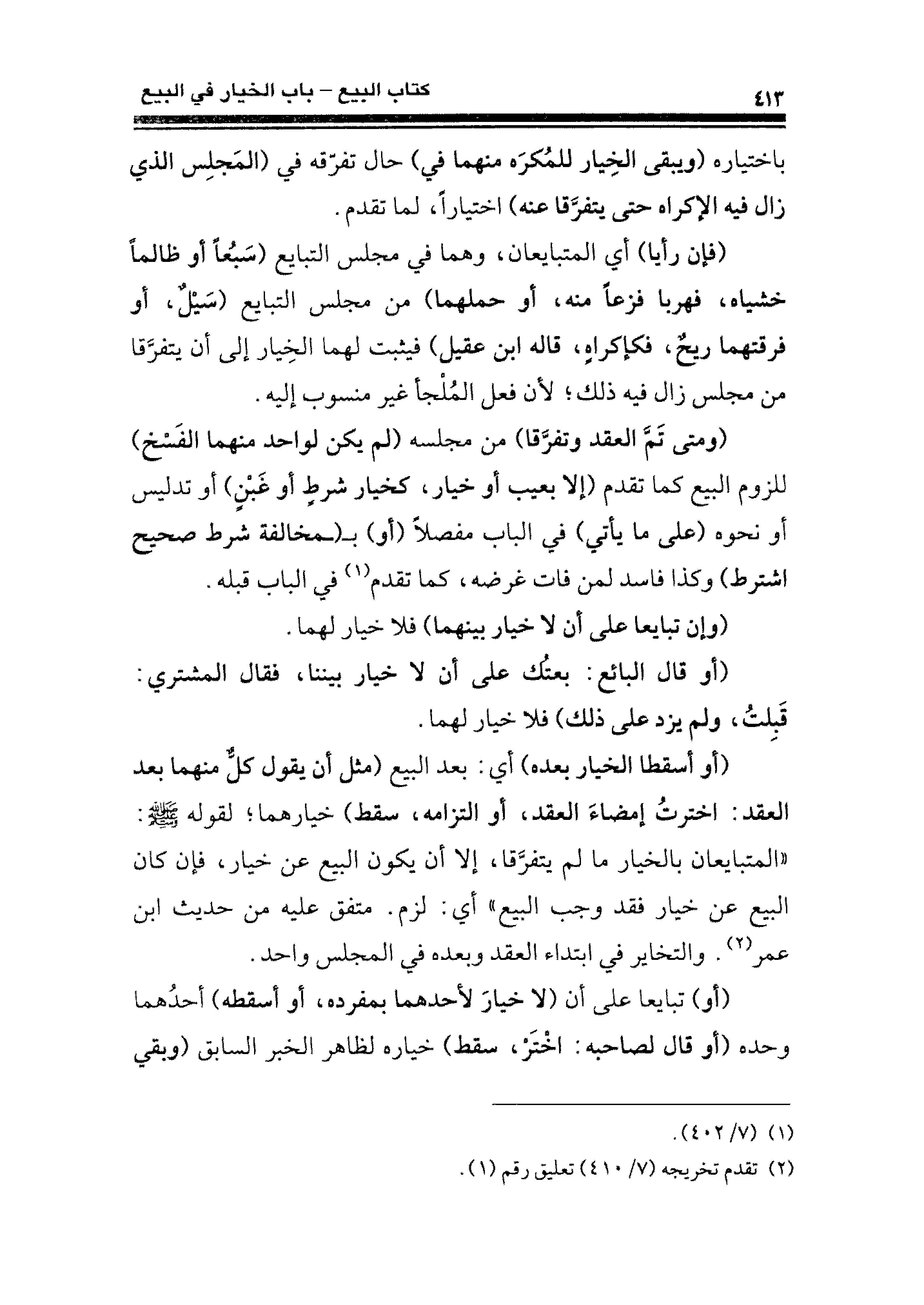 (أو أسقَطا الخيار بعده) أي: بعد البيع (مثل أن يقول كلٌّ منهما بعد العقد: اخترتُ إمضاءَ العقد، أو التزامه، سقط) خيارهما، لقوله: "المتبايعان بالخيار ما لم يتفرَّقا، إلا أن يكون البيع عن خيار، فإن كان البيع عن خيار فقد وجب البيع" أي: لزم. متفق عليه من حديث ابن عمر (¬٢). والتخاير في ابتداء العقد وبعده في المجلس واحد.