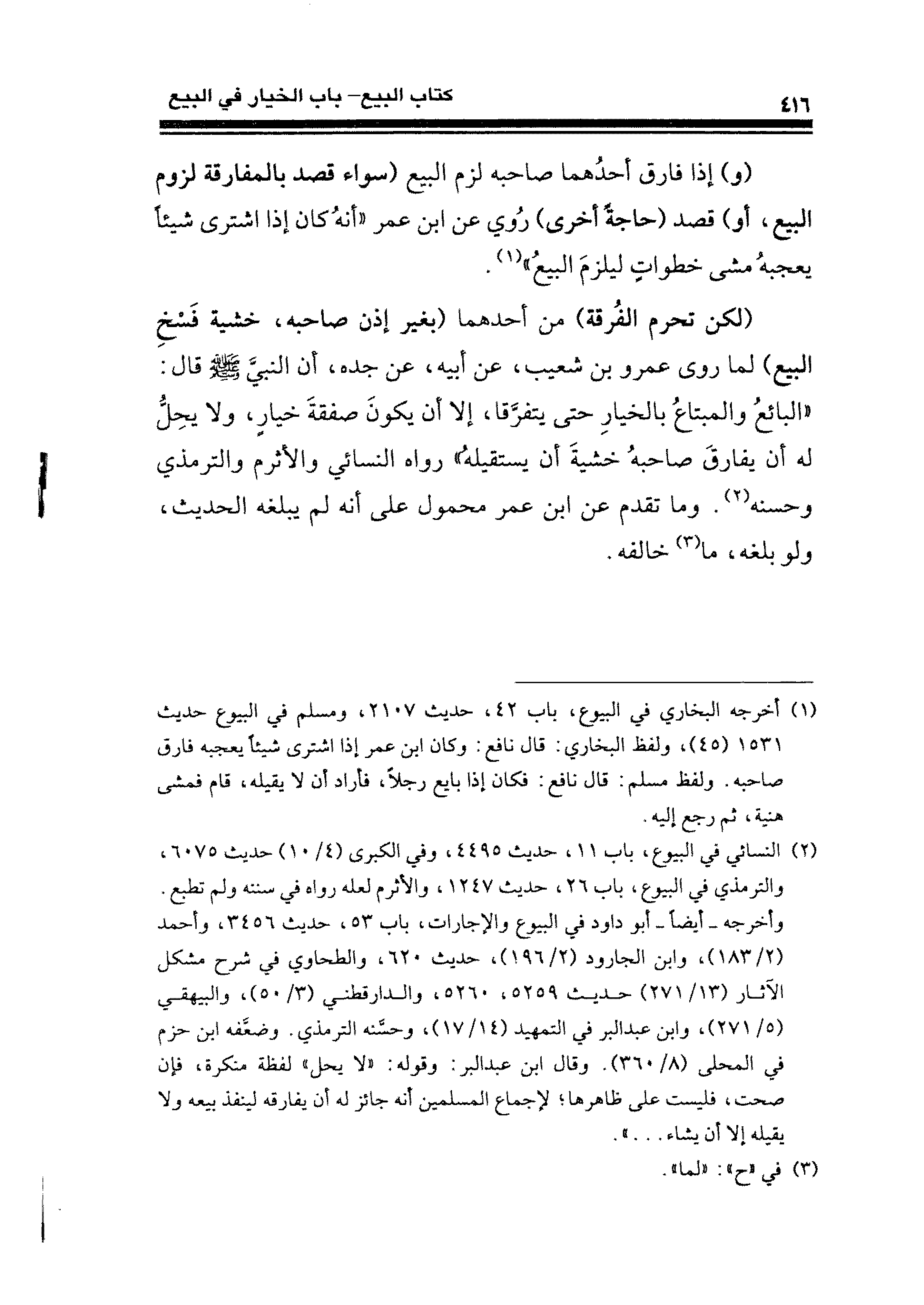 (¬١) أخرجه البخاري في البيوع، باب ٤٢، حديث ٢١٠٧، ومسلم في البيوع حديث ١٥٣١ (٤٥)، ولفظ البخاري: قال نافع: وكان ابن عمر إذا اشترى شيئًا يعجبه فارق صاحبه. ولفظ مسلم: قال نافع: فكان إذا بايع رجلًا، فأراد أن لا يقيله، قام فمشى هنية، ثم رجع إليه.