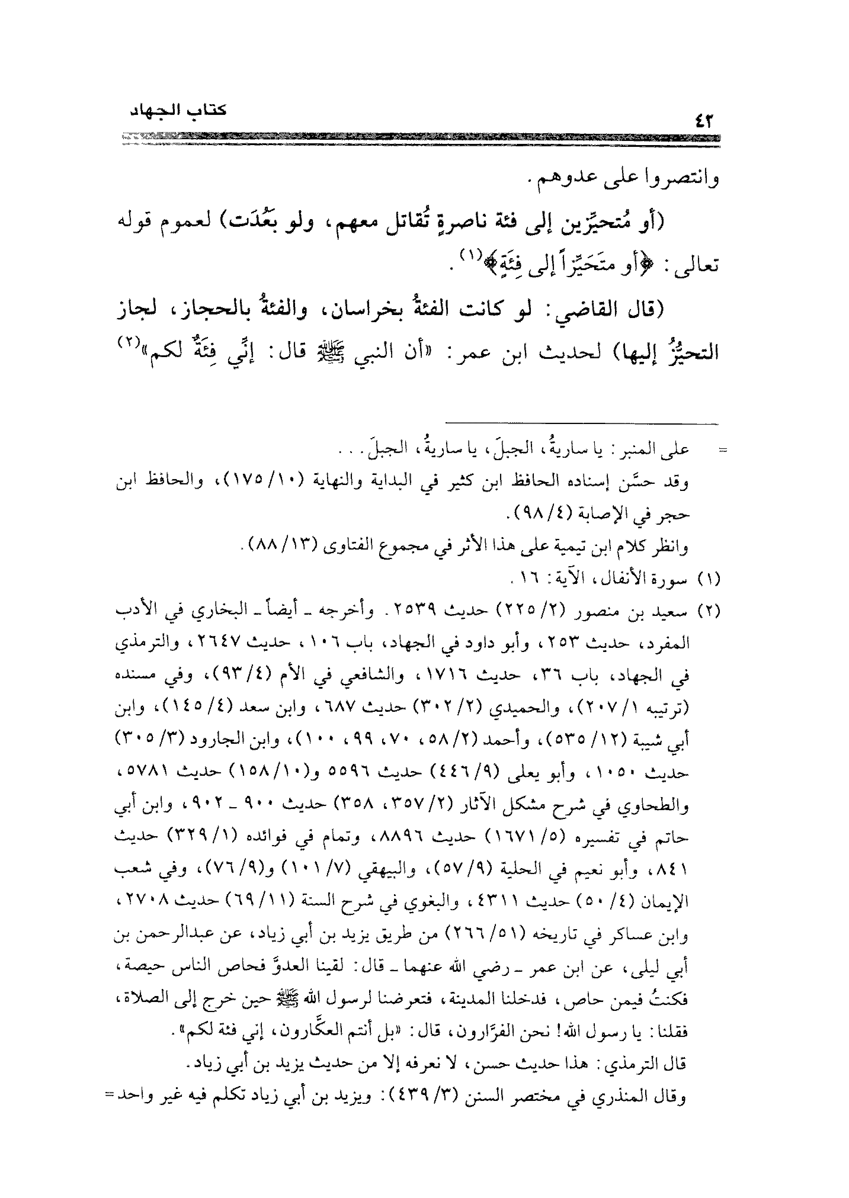 (قال القاضي: لو كانت الفئةُ بخراسان، والفئةُ بالحجاز، لجاز التحيُّزُ إليها) لحديث ابن عمر: "أن النبي - صلى الله عليه وسلم - قال: إنِّي فِئَةٌ لكم" (¬٢)