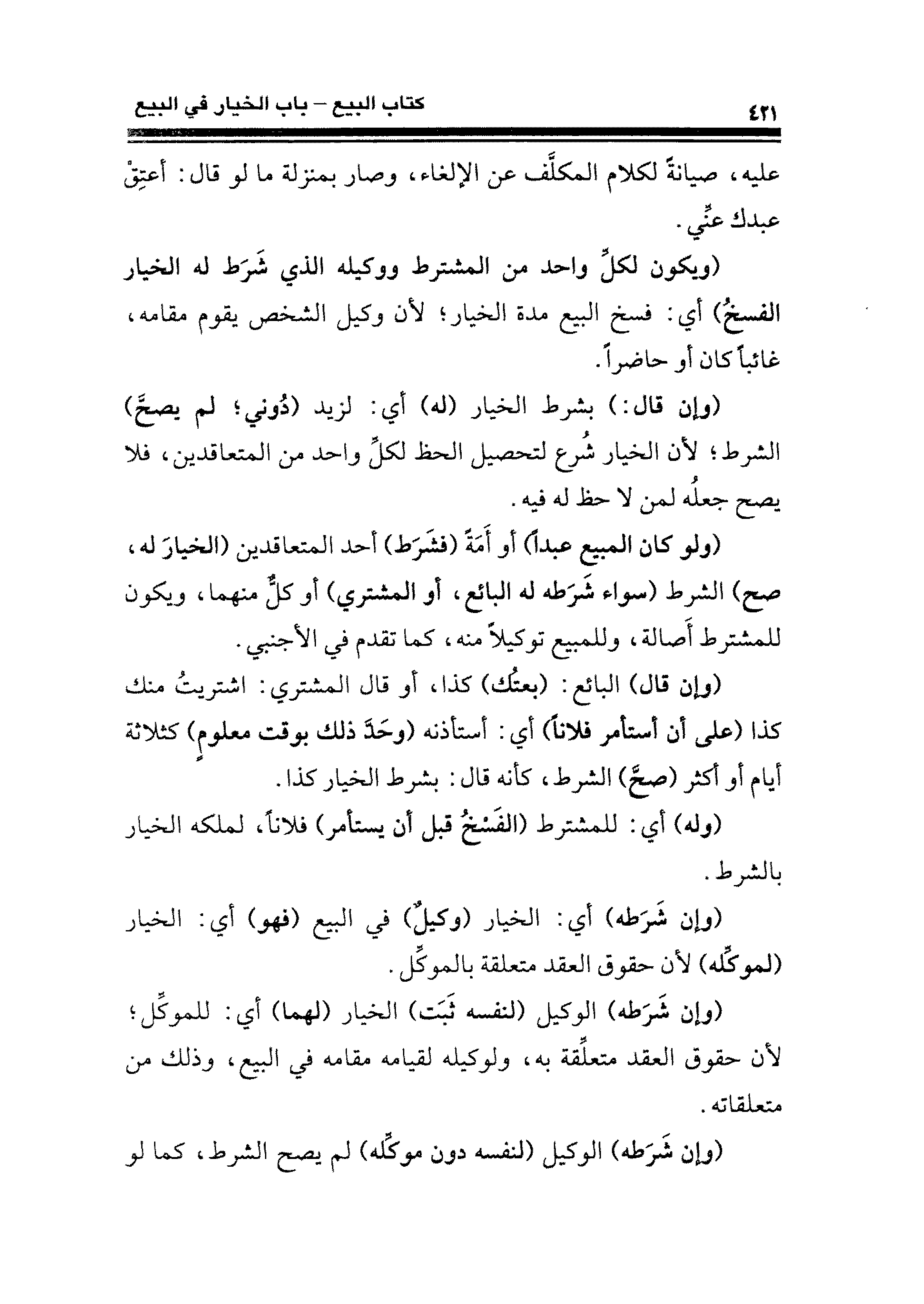 (ويكون لكلِّ واحد من المشترط ووكيله الذي شَرَط له الخيار الفسخُ) أي: فسخ البيع مدة الخيار؛ لأن وكيل الشخص يقوم مقامه، غائبًا كان أو حاضرًا.