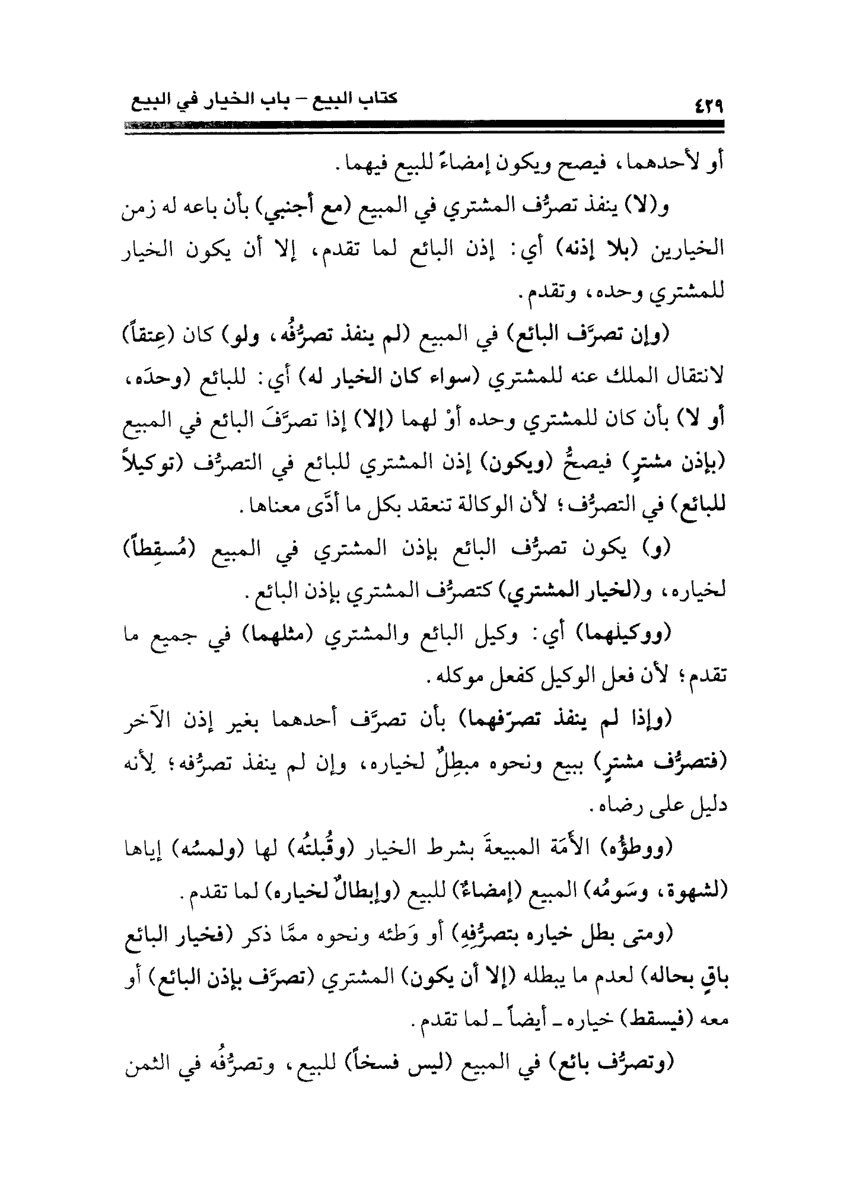 (و) يكون تصرُّف البائع بإذن المشتري في المبيع (مُسمطًا) لخياره، و (لخيار المشتري) كتصرُّف المشتري بإذن البائع.