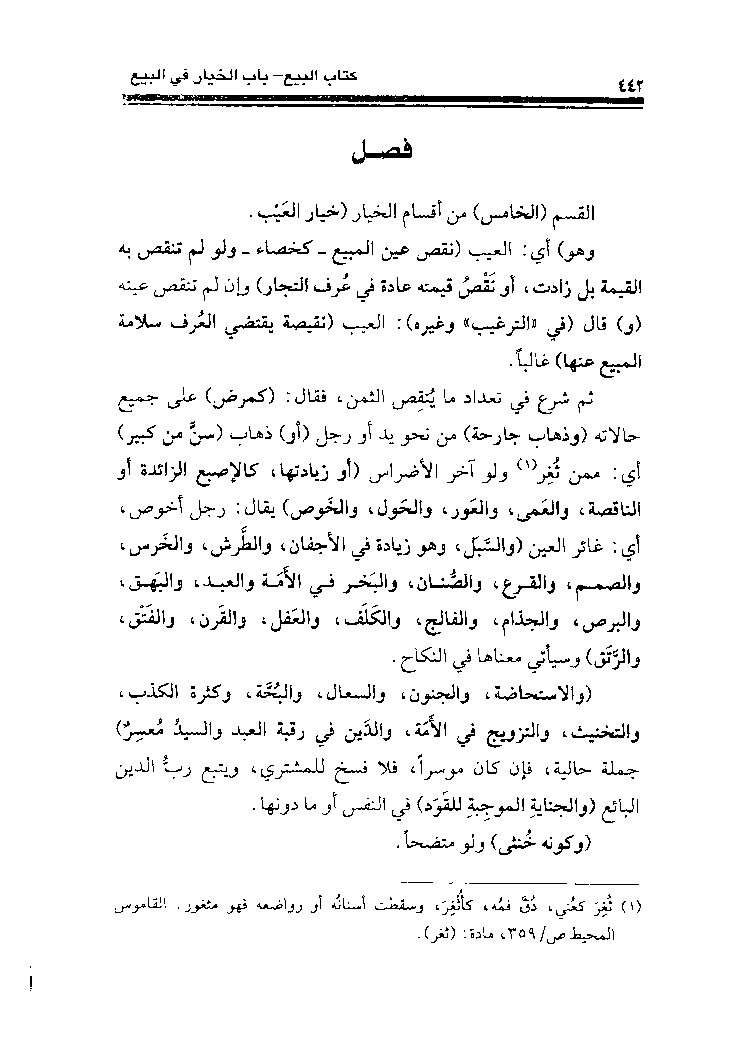 وهو) أي: العيب (نقص عين المبيع -كخصاء- ولو لم تنقص به القيمة بل زادت، أو نَقْصُ قيمته عادة في عُرف التجار) وإن لم تنقص عينه (و) قال (في "الترغيب" وغيره): العيب (نقيصة يقتضي العُرف سلامة المبيع عنها) غالبًا.