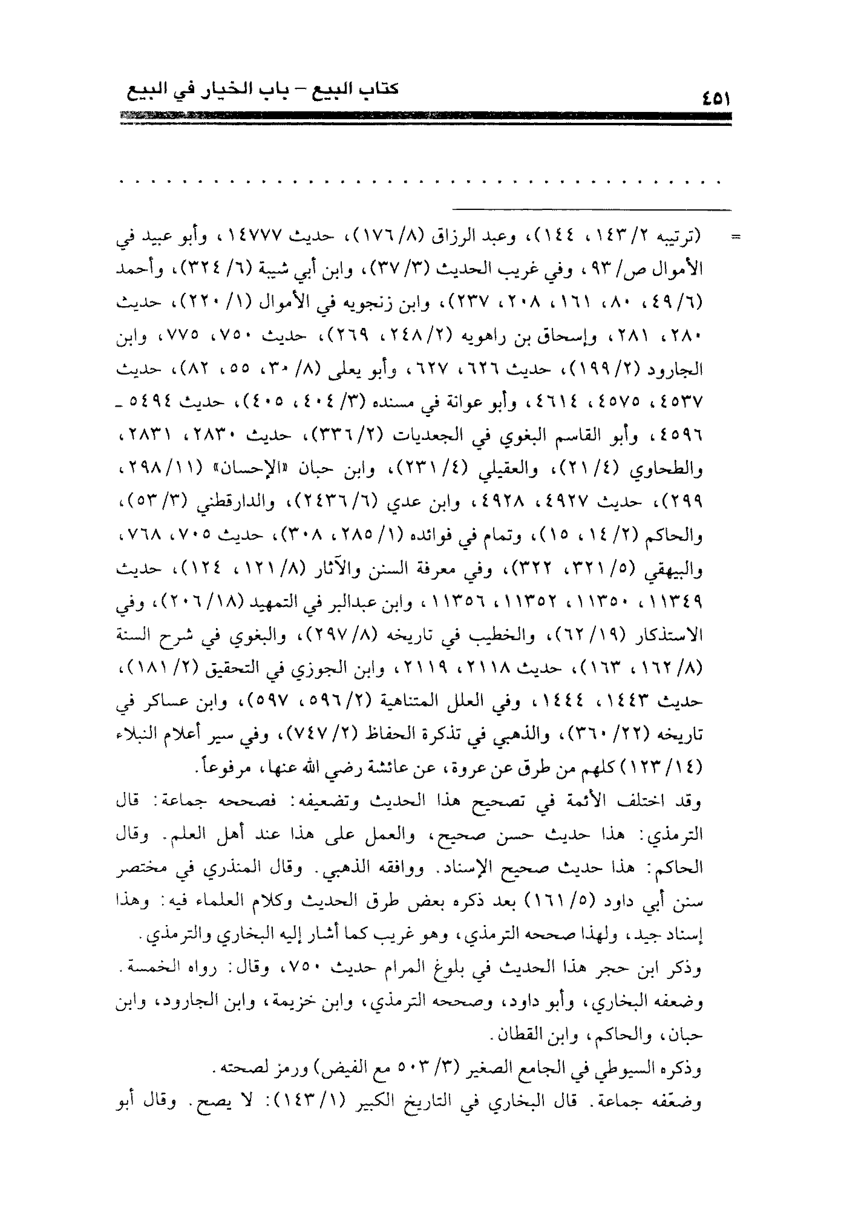 = (ترتيبه ٢/ ١٤٣، ١٤٤)، وعبد الرزاق (٨/ ١٧٦)، حديث ١٤٧٧٧، وأبو عبيد في الأموال ص / ٩٣، وفي غريب الحديث (٣/ ٣٧)، وابن أبي شيبة (٦/ ٣٢٤)، وأحمد (٦/ ٤٩، ٨٠، ١٦١، ٢٠٨، ٢٣٧)، وابن زنجويه في الأموال (١/ ٢٢٠)، حديث ٢٨٠، ٢٨١، وإسحاق بن راهويه (٢/ ٢٤٨، ٢٦٩)، حديث ٧٥٠، ٧٧٥، وابن الجارود (٢/ ١٩٩)، حديث ٦٢٦، ٦٢٧، وأبو يعلى (٨/ ٣٠، ٥٥، ٨٣)، حديث ٤٥٣٧، ٤٥٧٥، ٤٦١٤، وأبو عوانة في مسنده (٣/ ٤٠٤، ٤٠٥)، حديث ٥٤٩٤ - ٤٥٩٦، وأبو القاسم البغوي في الجعديات (٢/ ٣٣٦)، حديث ٢٨٣٠، ٢٨٣١، والطحاوي (٤/ ٢١)، والعقيلي (٤/ ٢٣١)، وابن حبان "الإحسان" (١١/ ٢٩٨، ٢٩٩)، حديث ٤٩٢٧، ٤٩٢٨، وابن عدي (٦/ ٢٤٣٦)، والدارقطني (٣/ ٥٣)، والحاكم (٢/ ١٤، ١٥)، وتمام في فوائده (١/ ٢٨٥، ٣٠٨)، حديث ٧٠٥، ٧٦٨، والبيهقي (٥/ ٣٢١، ٣٢٢)، وتمام في معرفة السنن والآثار (٨/ ١٢١، ١٢٤)، حديث ١١٣٤٩، ١١٣٥٠، ١١٣٥٢، ١١٣٥٦، وابن عبد البر في التمهيد (١٨/ ٢٠٦)، وفي الاستذكار (١٩/ ٦٢)، والخطيب في تاريخه (٨/ ٢٩٧)، والبغوي في شرح السنة (٨/ ١٦٢، ١٦٣)، حديث ٢١١٨، ٢١١٩، وابن الجوزي في التحقيق (٢/ ١٨١)، حديث ١٤٤٣، ١٤٤٤، وفي العلل المتناهية (٥٩٦/ ٢، ٥٩٧)، وابن عساكر في تاريخه (٢٢/ ٣٦٠)، والذهبي في تذكرة الحفاظ (٣/ ٧٤٧)، وفي سير أعلام النبلاء (١٤/ ١٢٣) كلهم من طرق عن عروة، عن عائشة رضي الله عنها، مرفوعًا.