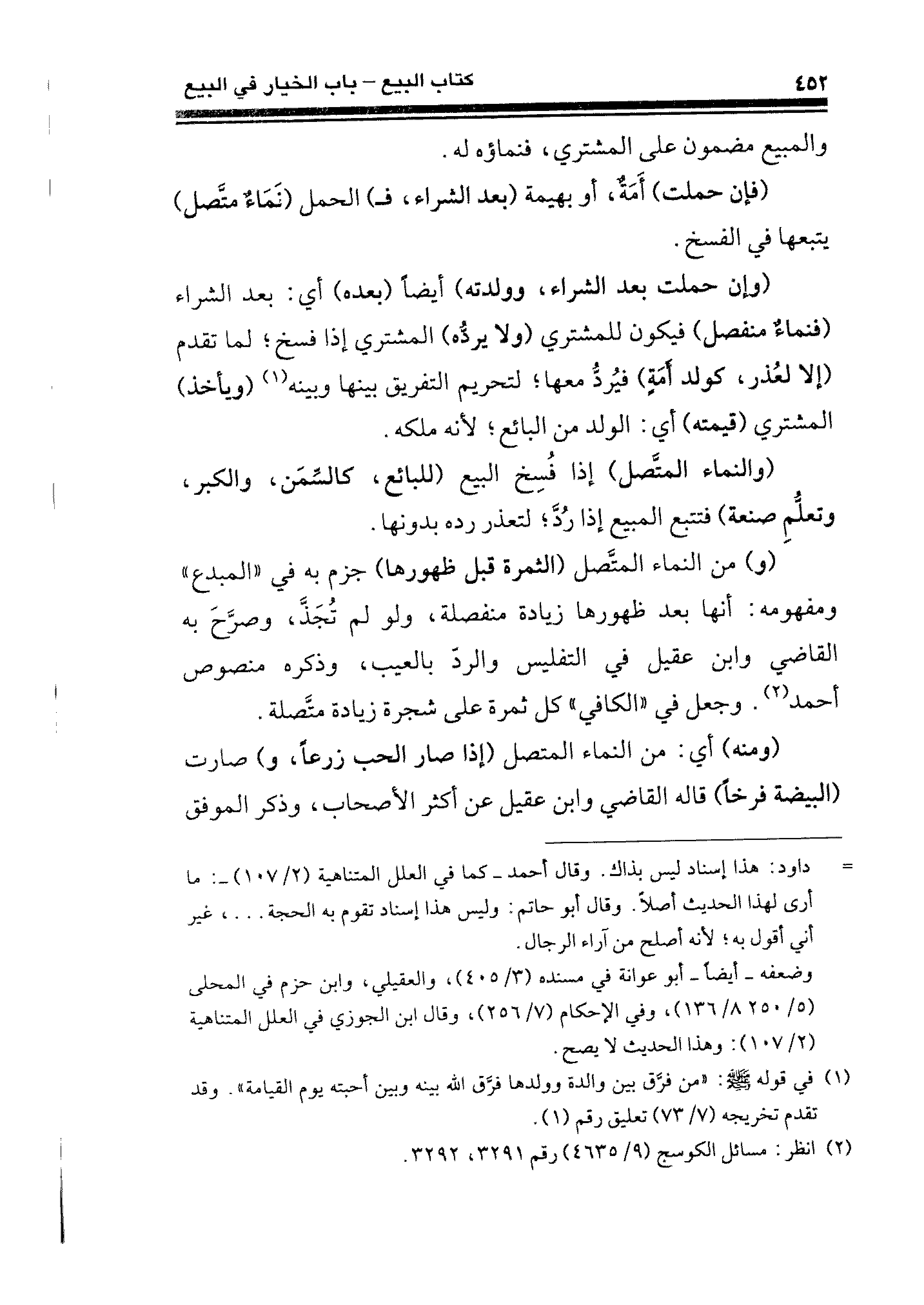 (وإن حملت بعد الشراء، وولدته) أيضًا (بعده) أي: بعد الشراء (فنماءٌ منفصل) فيكون للمشتري (ولا يردُّه) المشتري إذا فسخ؛ لما تقدم (إلا لعُذر، كولد أمَةٍ) فيُردُّ معها؛ لتحريم التفريق بينها وبينه (¬١) (ويأخذ) المشتري (قيمته) أي: الولد من البائع؛ لأنه ملكه.