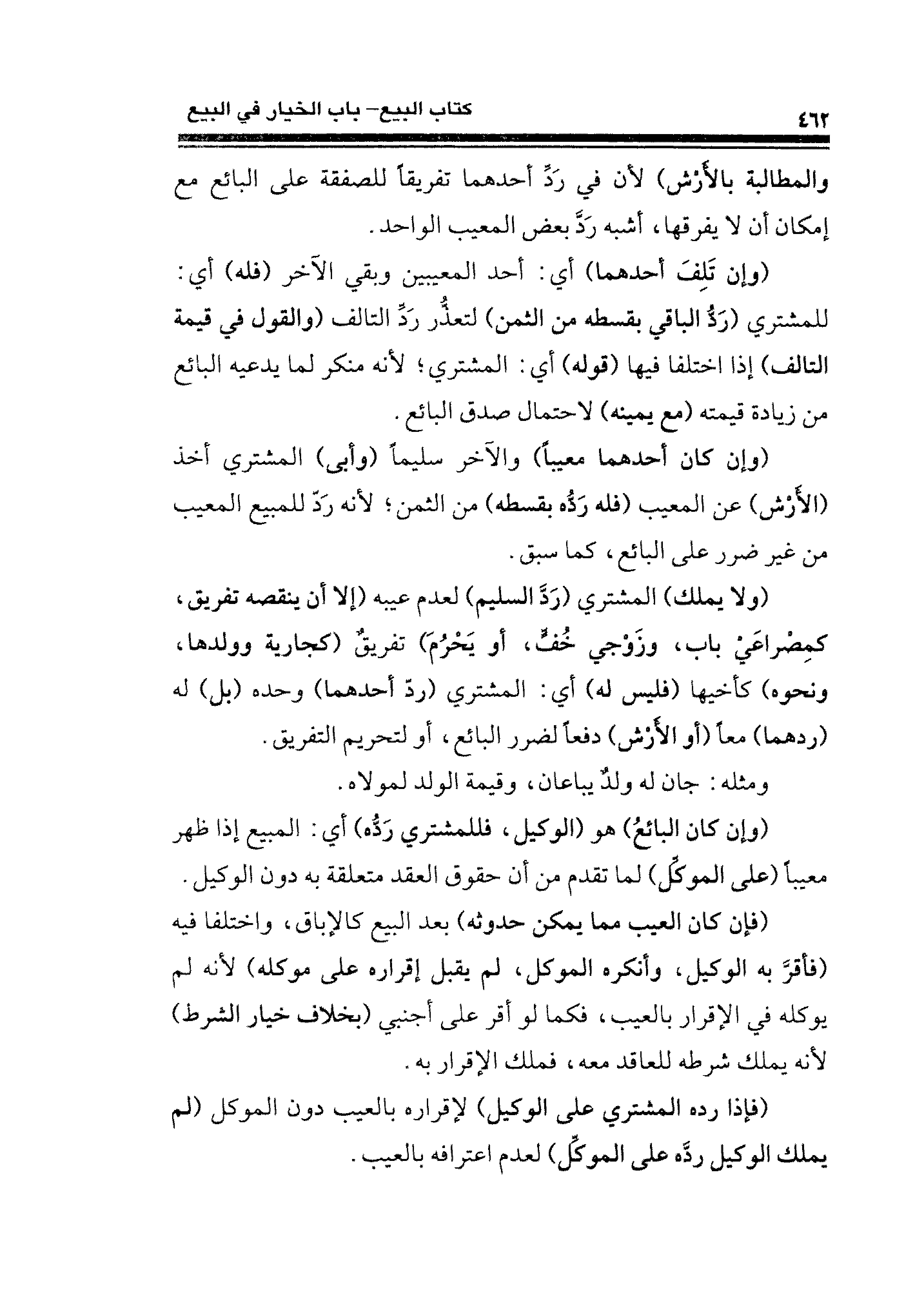 (ولا يملك) المشتري (رَدَّ السليم) لعدم عيبه (إلا أن ينقصه تفريق، كمِصْراعَيْ باب، وزَوْجيْ خُفٍّ، أو يَحْرُمَ) تفريقٌ (كجارية وولدها، ونحوه) كأخيها (فليس له) أي: المشتري (ردّ أحدهما) وحده (بل) له (ردهما) معًا (أو الأَرْش) دفعًا لضرر البائع، أو لتحريم التفريق.