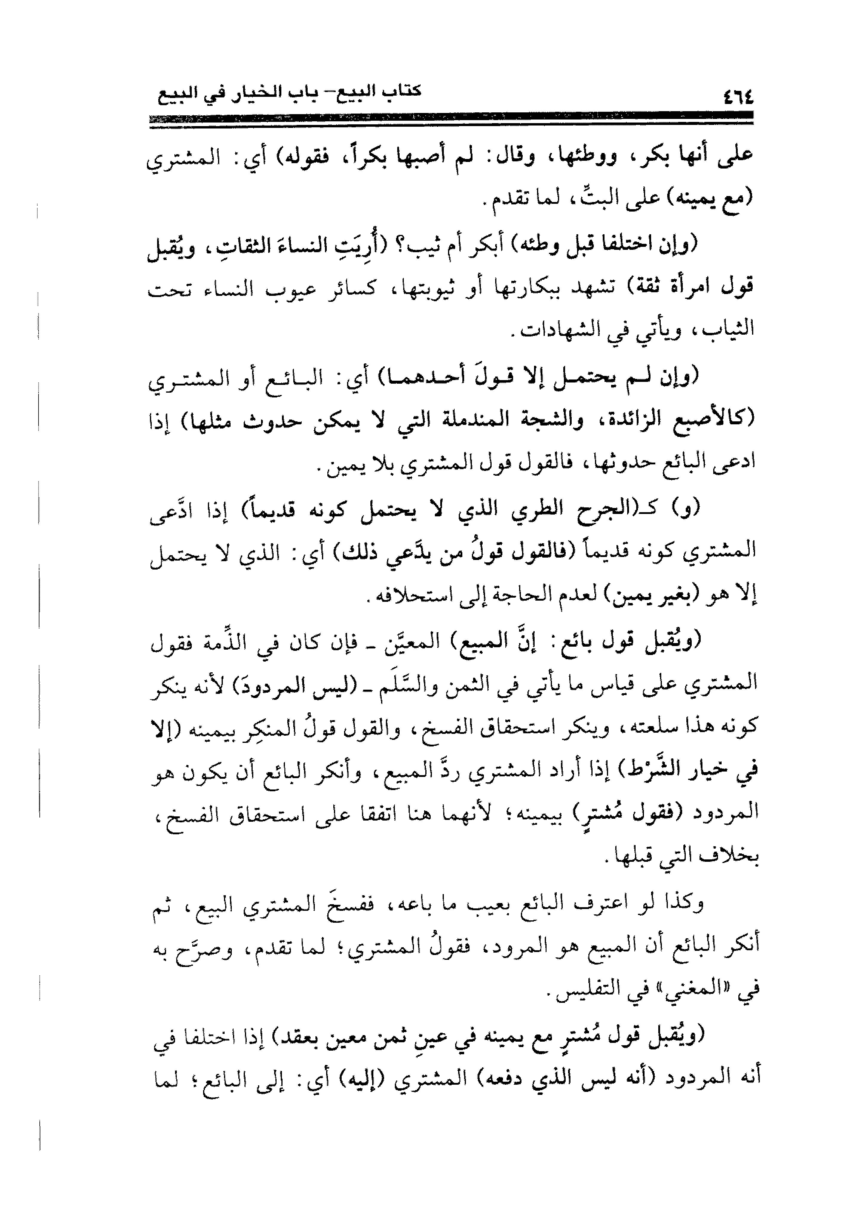 (ويُقبل قول بائع: إنَّ المبيع) المعيَّن -فإن كان في الذِّمة فقول المشتري على قياس ما يأتي في الثمن والسَّلَم- (ليس المردودَ) لأنه ينكر كونه هذا سلعته، وينكر استحقاق الفسخ، والقول قولُ المنكِر بيمينه (إلا في خيار الشَّرْط) إذا أراد المشتري ردَّ المبيع، وأنكر البائع أن يكون هو المردود (فقول مُشترٍ) بيمينه؛ لأنهما هنا اتفقا على استحقاق الفسخ، بخلاف التي قبلها.