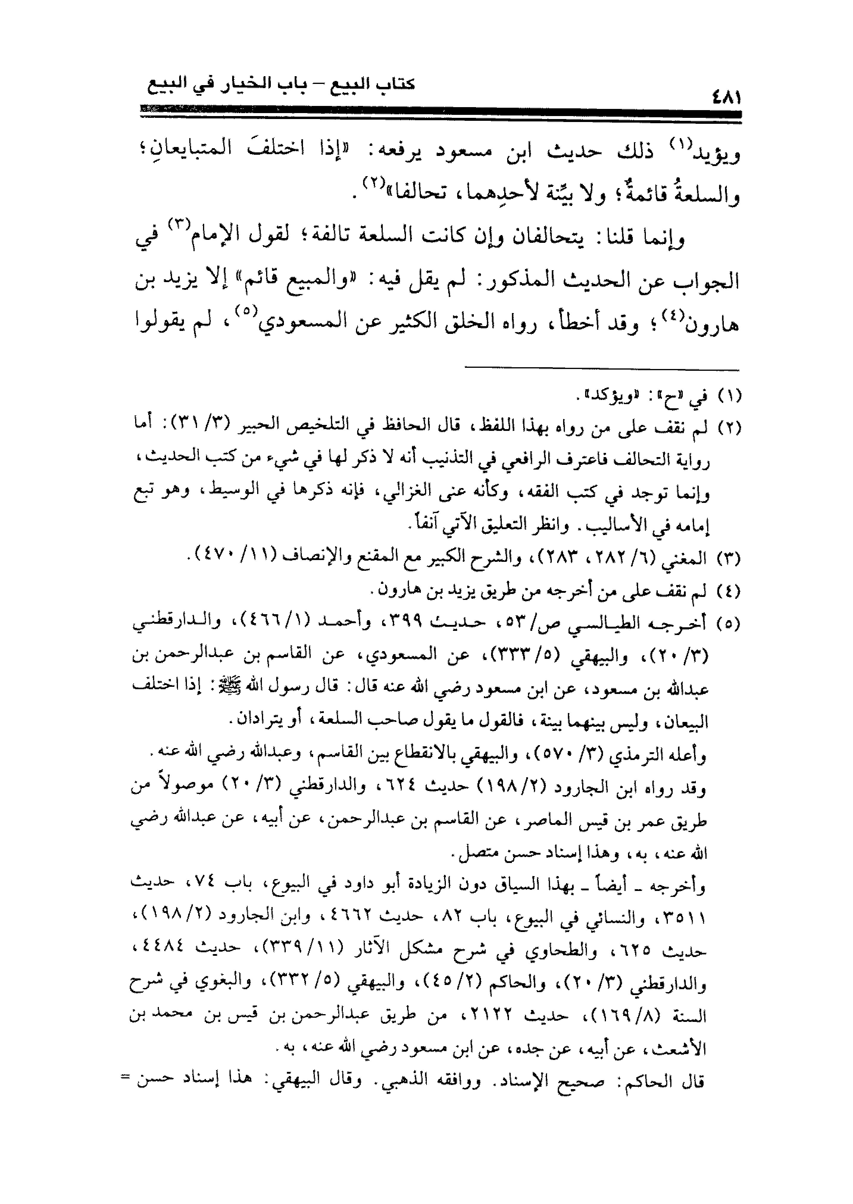 (¬٥) أخرجه الطيالسي ص/ ٥٣، حديث ٣٩٩، وأحمد (١/ ٤٦٦)، والدارقطني (٣/ ٢٠)، والبيهقي (٥/ ٣٣٣)، عن المسعودي، عن القاسم بن عبد الرحمن بن عبد الله بن مسعود، عن ابن مسعود رضي الله عنه قال: قال رسول الله - صلى الله عليه وسلم -: إذا اختلف البيعان، وليس بينهما بينة، فالقول ما يقول صاحب السلعة، أو يترادان.