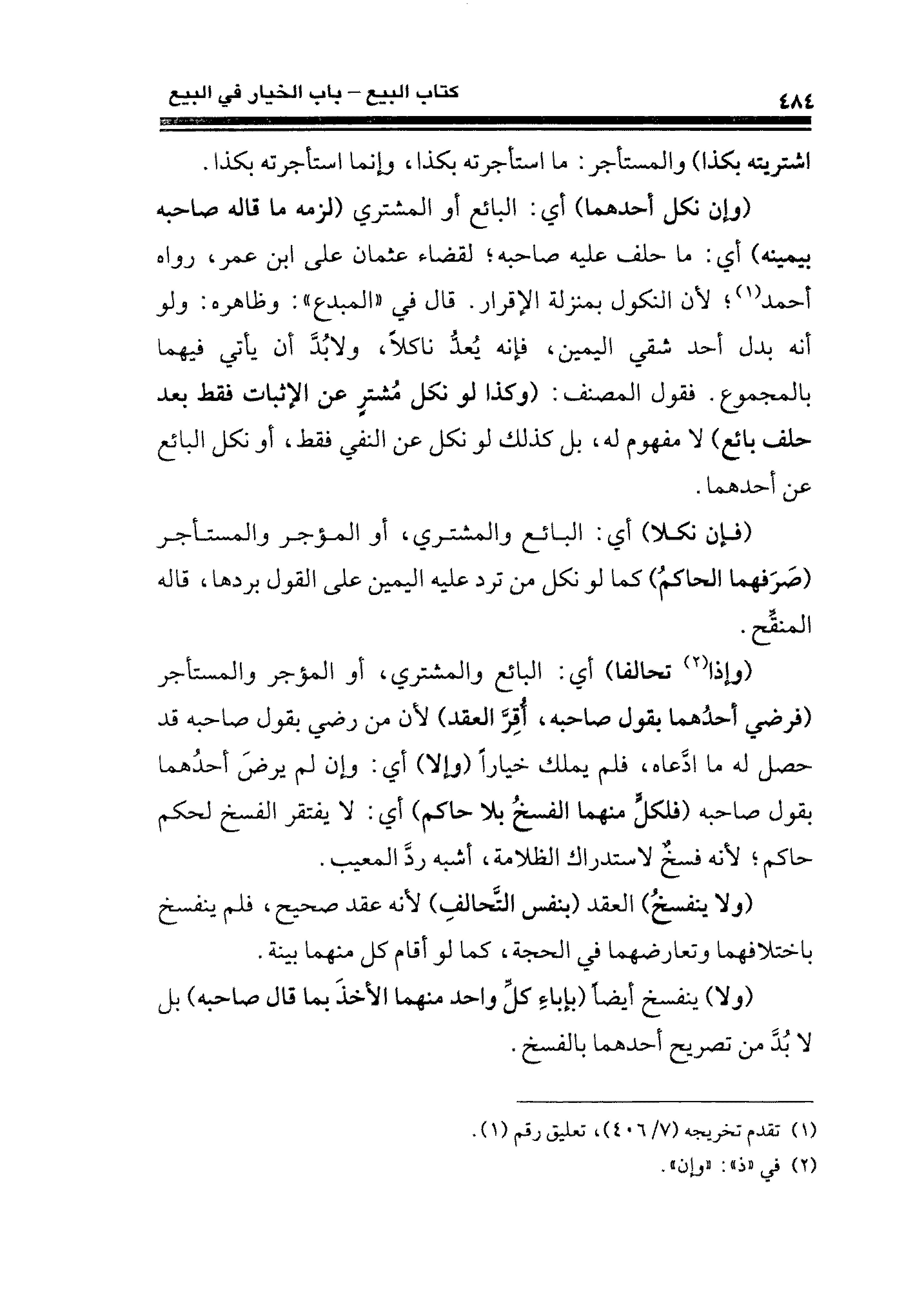 (وإن نكل أحدهما) أي: البائع أو المشتري (لزمه ما قاله صاحبه بيمينه) أي: ما حلف عليه صاحبه؛ لقضاء عثمان على ابن عمر، رواه أحمد (¬١)؛ لأن النكول بمنزلة الإقرار. قال في "المبدع": وظاهره: ولو أنه بدل أحد شقي اليمين، فإنه يُعدُّ ناكلًا، ولا بُدَّ أن يأتي فيهما بالمجموع. فقول المصنف: (وكذا لو نكل مُشترٍ عن الإثبات فقط بعد حلف بائع) لا مفهوم له، بل كذلك لو نكل عن النفي فقط، أو نكل البائع عن أحدهما.