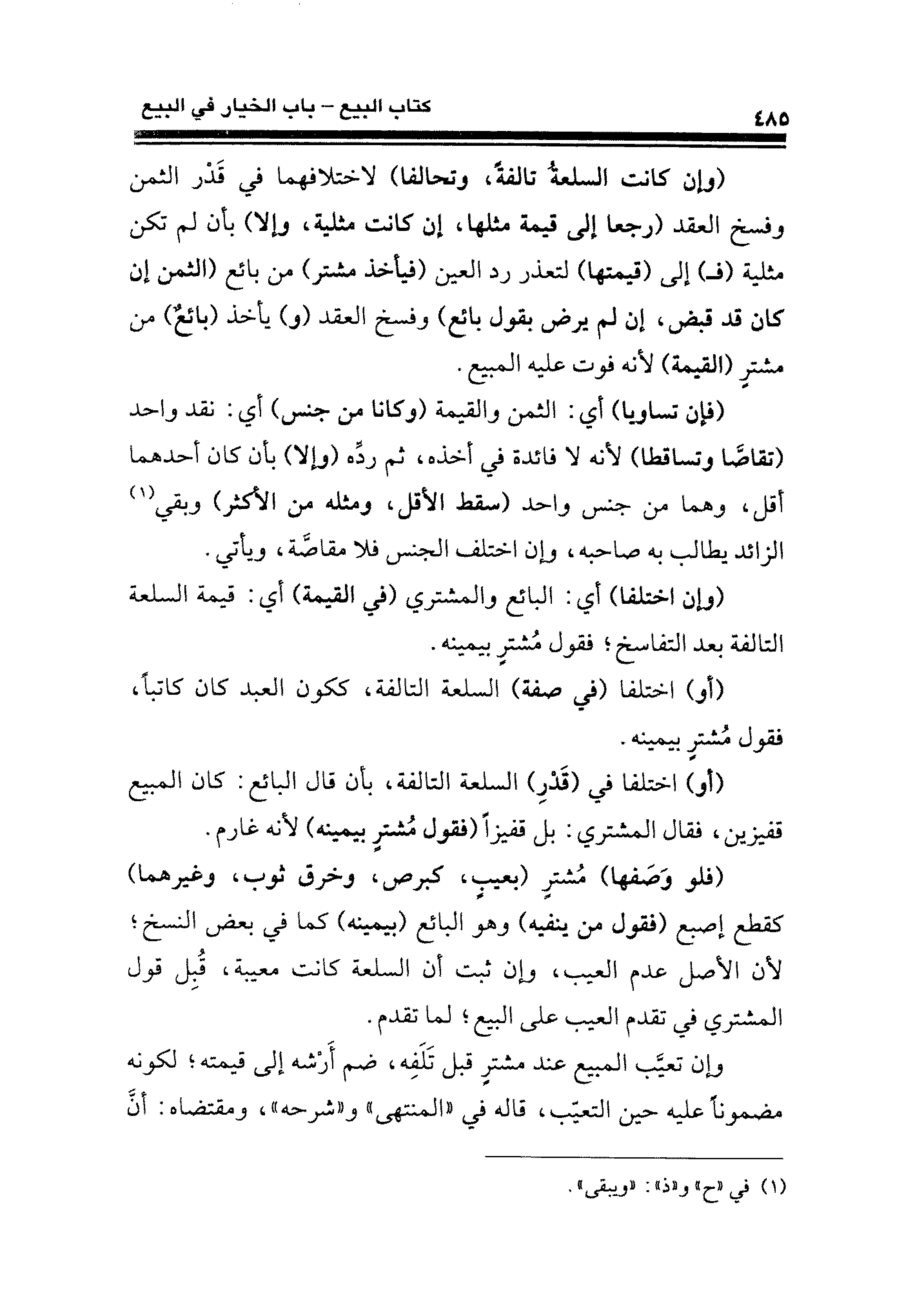 (وإن كانت السلعةُ تالفةَ، وتحالفا) لاختلافهما في قَدر الثمن وفسخ العقد (رجعا إلى قيمة مثلها، إن كانت مثلية، وإلا) بأن لم تكن مثلية (فـ) إلى (قيمتها) لتعذر رد العين (فيأخذ مشتر) من بائع (الثمن إن كان قد قبض، إن لم يرض بقول بائع) وفسخ العقد (و) يأخذ (بائعٌ) من مشترٍ (القيمة) لأنه فوت عليه المبيع.