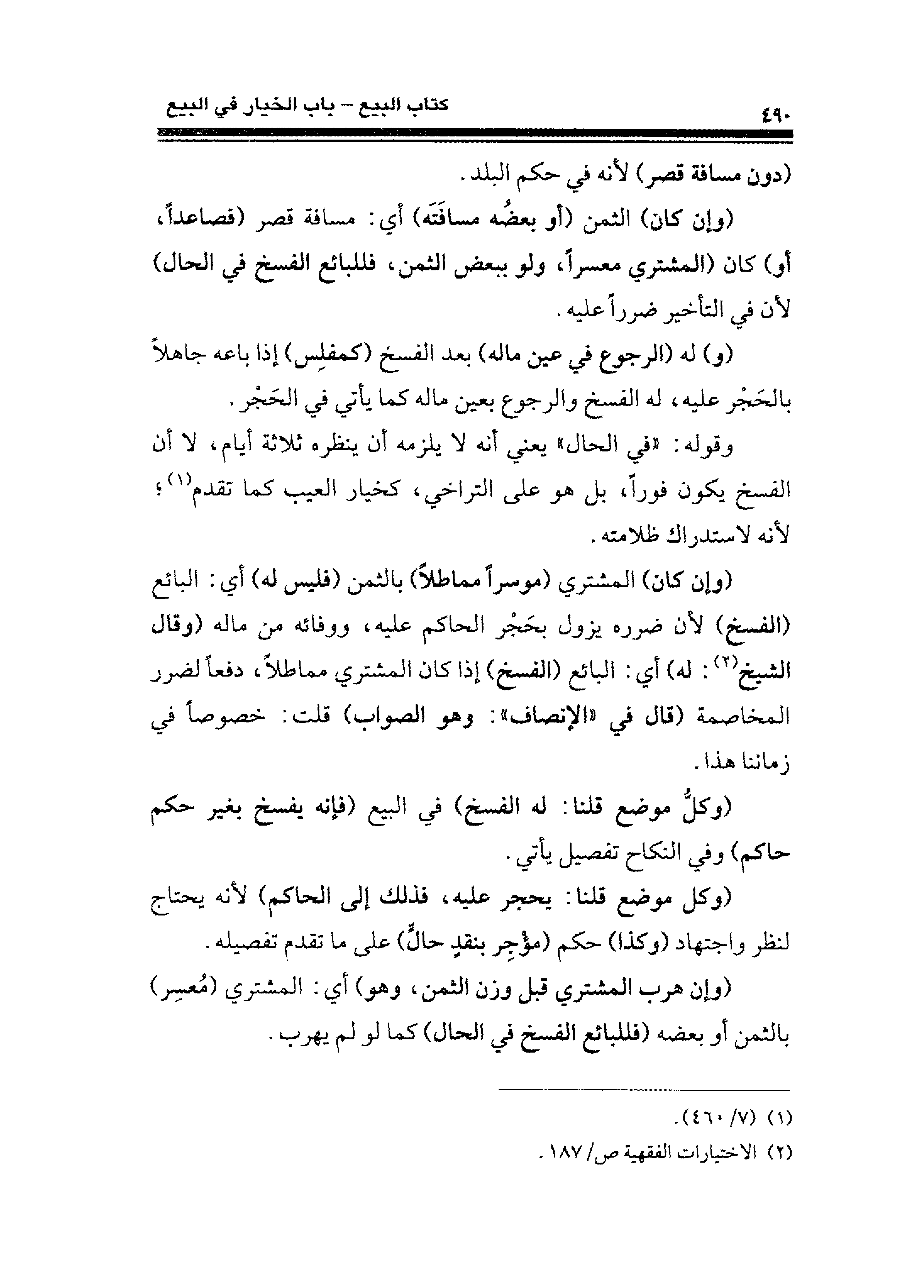 (وإن كان) المشتري (موسرًا مماطلًا) بالثمن (فليس له) أي: البائع (الفسخ) لأن ضرره يزول بحَجْر الحاكم عليه، ووفائه من ماله (وقال الشيخ (¬٢): له) أي: البائع (الفسخ) إذا كان المشتري مماطلًا، دفعًا لضرر المخاصمة (قال في "الإنصاف": وهو الصواب) قلت: خصوصًا في زماننا هذا.