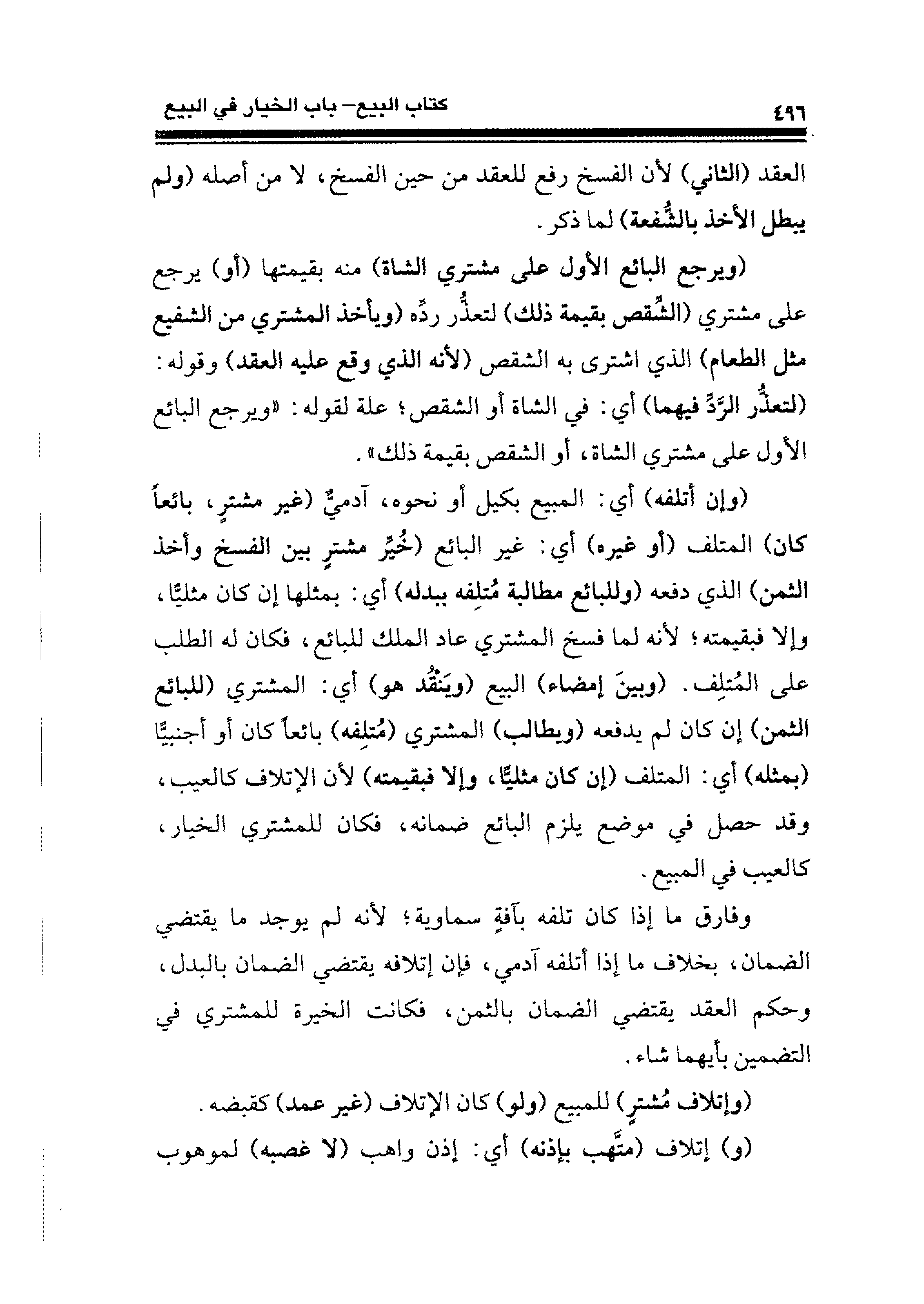 (ويرجع البائع الأول على مشتري الشاة) منه بقيمتها (أو) يرجع على مشتري (الشِّقص بقيمة ذلك) لتعذُّر ردِّه (ويأخذ المشتري من الشفيع مثل الطعام) الذي اشترى به الشقص (لأنه الذي وقع عليه العقد) وقوله: (لتعذُّر الرَّدِّ فيهما) أي: في الشاة أو الشقص؛ علة لقوله: "ويرجع البائع الأول على مشتري الشاة، أو الشقص بقيمة ذلك".