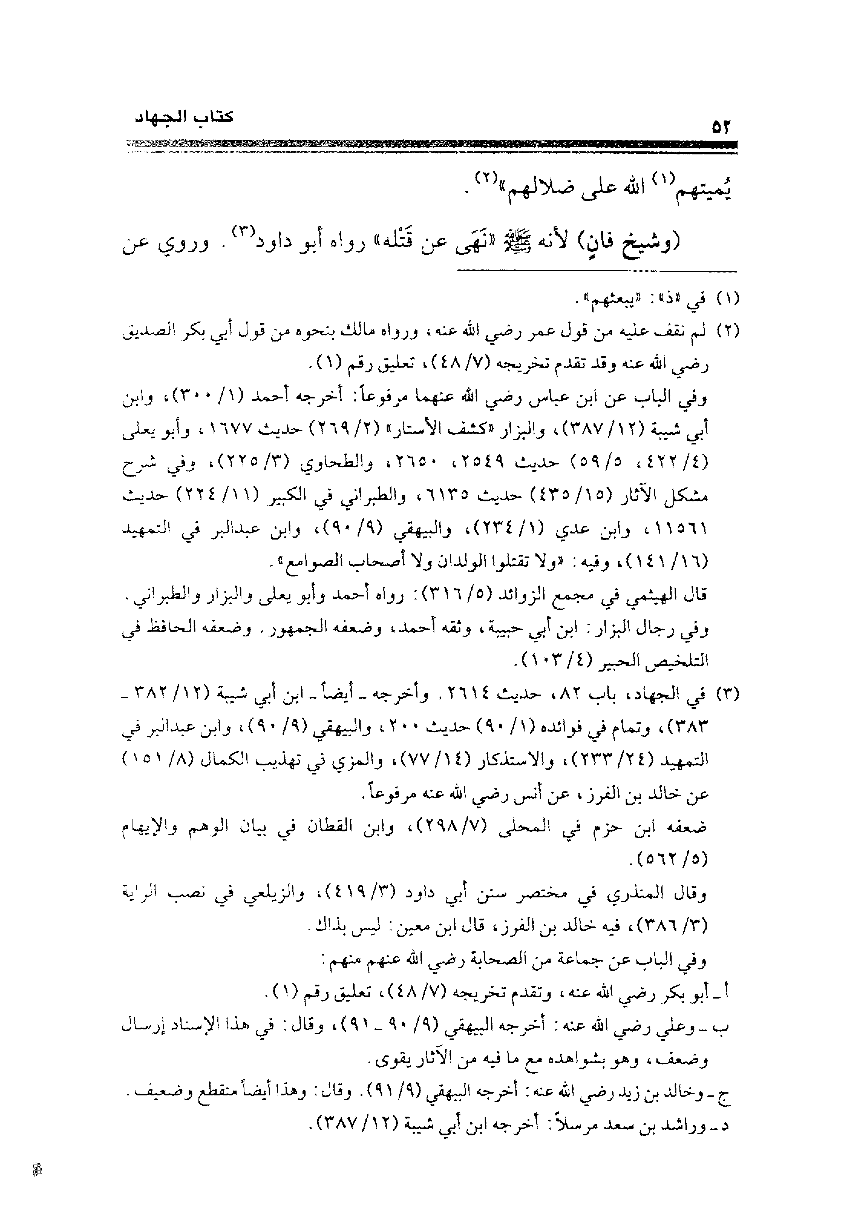 ب- وعلي رضي الله عنه: أخرجه البيهقى (٩/ ٩٠ - ٩١)، وقال: في هذا الإسناد إرسال وضعف، وهو بشواهده مع ما فيه من الآثار يقوى.