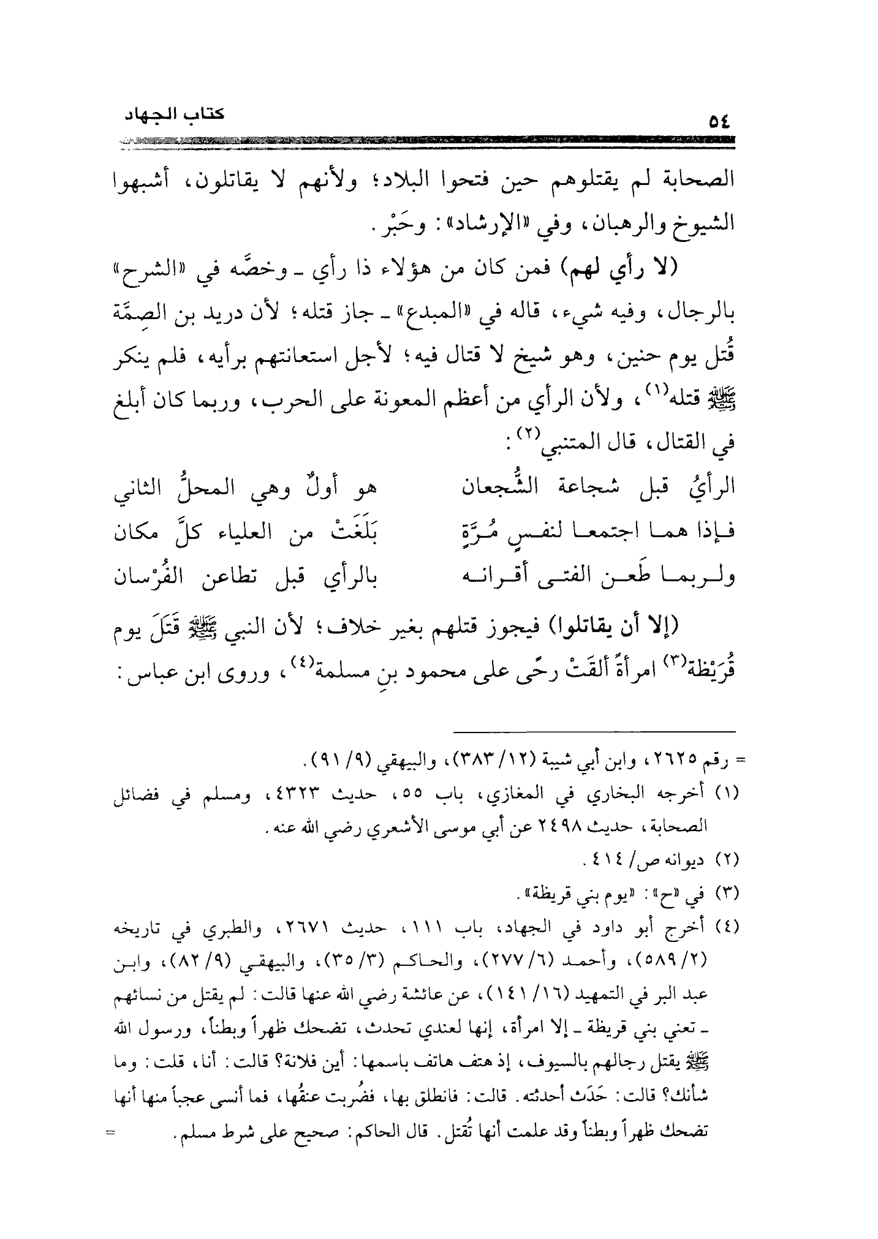 (لا رأي لهم) فمن كان من هؤلاء ذا رأي -وخصَّه في "الشرح" بالرجال، وفيه شيء، قاله في "المبدع"- جاز قتله؛ لأن دريد بن الصِمَّة قُتل يوم حنين، وهو شيخ لا قتال فيه؛ لأجل استعانتهم برأيه، فلم ينكر - صلى الله عليه وسلم - قتله (¬١)، ولأن الرأي من أعظم المعونة على الحرب، وربما كان أبلغ في القتال، قال المتنبي (¬٢):