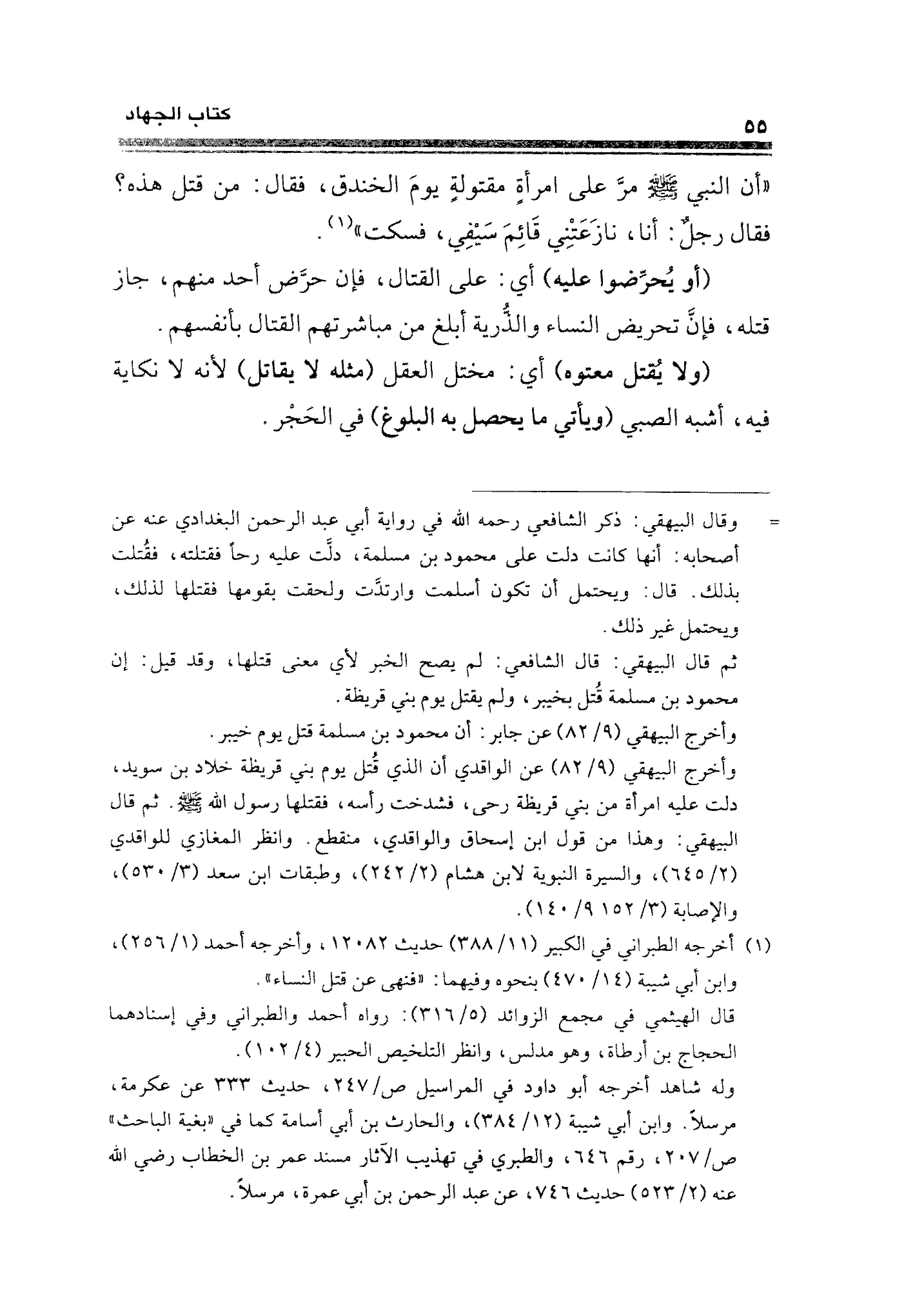 "أن النبي - صلى الله عليه وسلم - مرَّ على امرأةٍ مقتولةٍ يومَ الخندق، فقال: من قتل هذه؟ فقال رجلٌ: أنا، نازَعَتْنِي قَائِمَ سَيْفِي، فسكت" (¬١).