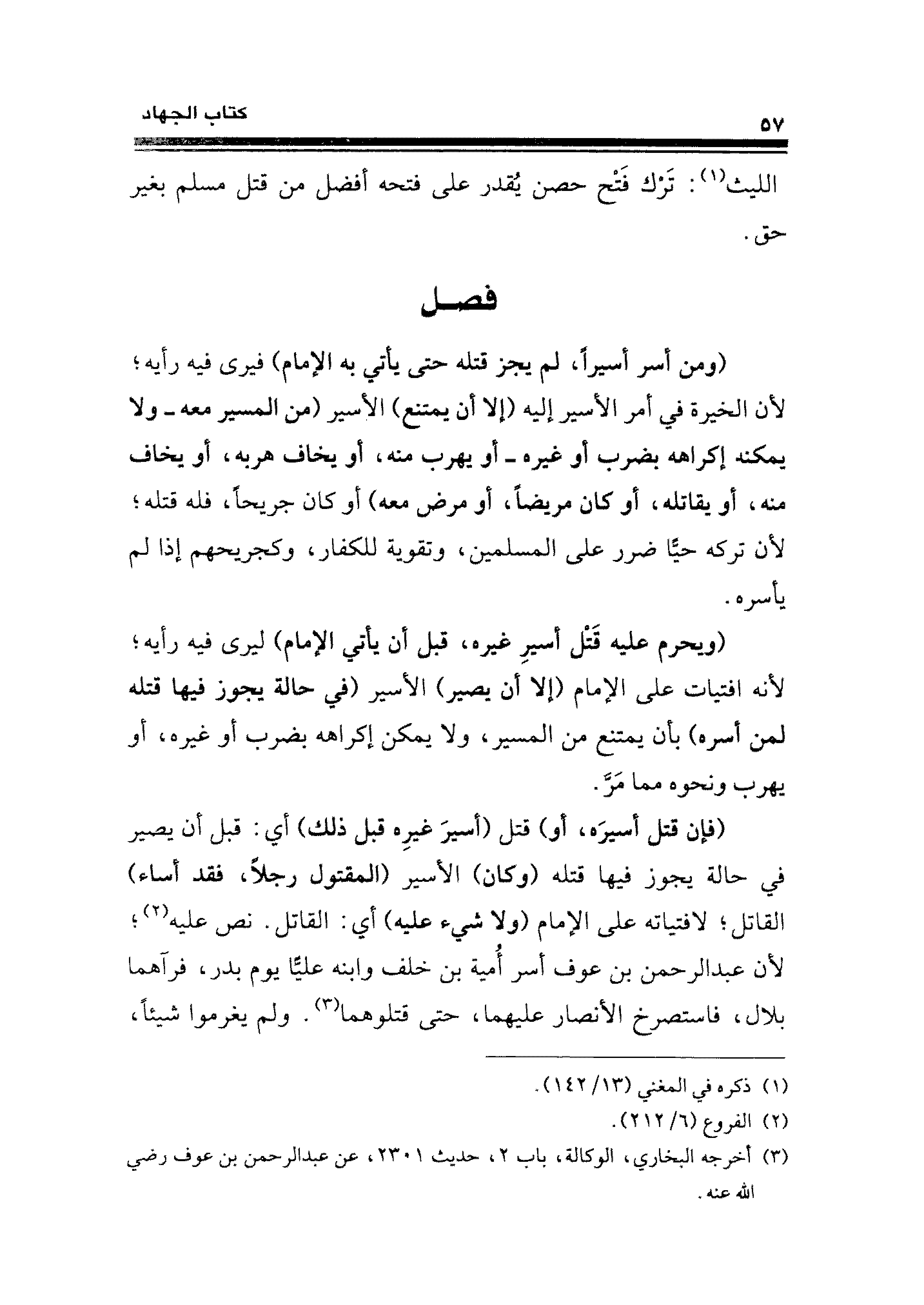 (ومن أسر أسيرًا، لم يجز قتله حتى يأتي به الإمام) فيرى فيه رأيه؛ لأن الخيرة في أمر الأسير إليه (إلا أن يمتنع) الأسير (من المسير معه -ولا يمكنه إكراهه بضرب أو غيره- أو يهرب منه، أو يخاف هربه، أو يخاف منه، أو يقاتله، أو كان مريضًا، أو مرض معه) أو كان جريحًا، فله قتله؛ لأن تركه حيًّا ضرر على المسلمين، وتقوية للكفار، وكجريحهم إذا لم يأسره.