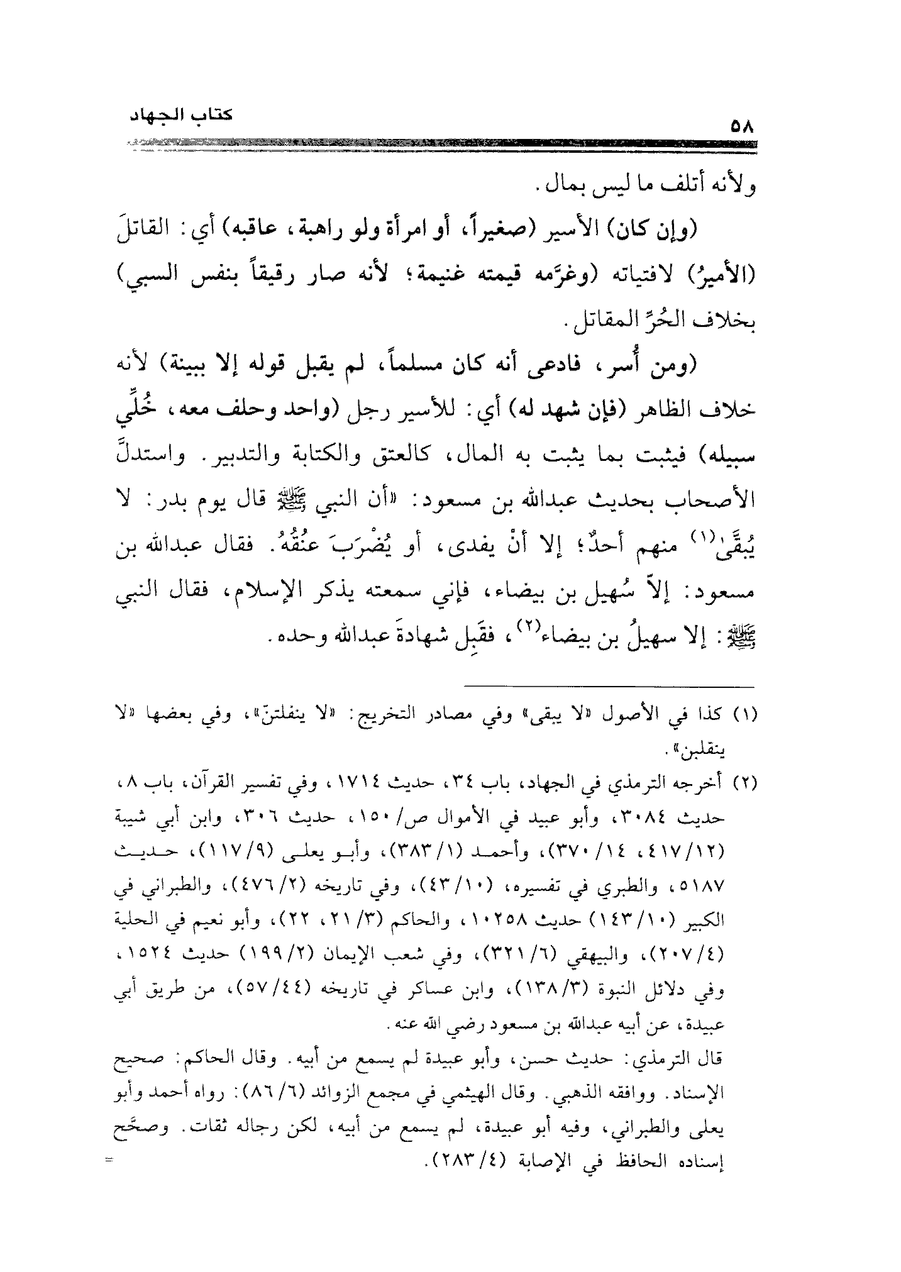 (ومن أُسر، فادعى أنه كان مسلمًا، لم يقبل قوله إلا ببينة) لأنه خلاف الظاهر (فإن شهد له) أي: للأسير رجل (واحد وحلف معه، خُلِّي سبيله) فيثبت بما يثبت به المال، كالعتق والكتابة والتدبير. واستدلَّ الأصحاب بحديث عبد الله بن مسعود: "أن النبي - صلى الله عليه وسلم - قال يوم بدر: لا يُبقَّى (¬١) منهم أحدٌ؛ إلا أنْ يفدى، أو يُضْرَبَ عنُقُهُ. فقال عبد الله بن مسعود: إلاّ سُهيل بن بيضاء، فإني سمعته يذكر الإسلام، فقال النبي - صلى الله عليه وسلم -: إلا سهيلُ بن بيضاء (¬٢)، فقَبِل شهادةَ عبد الله وحده.