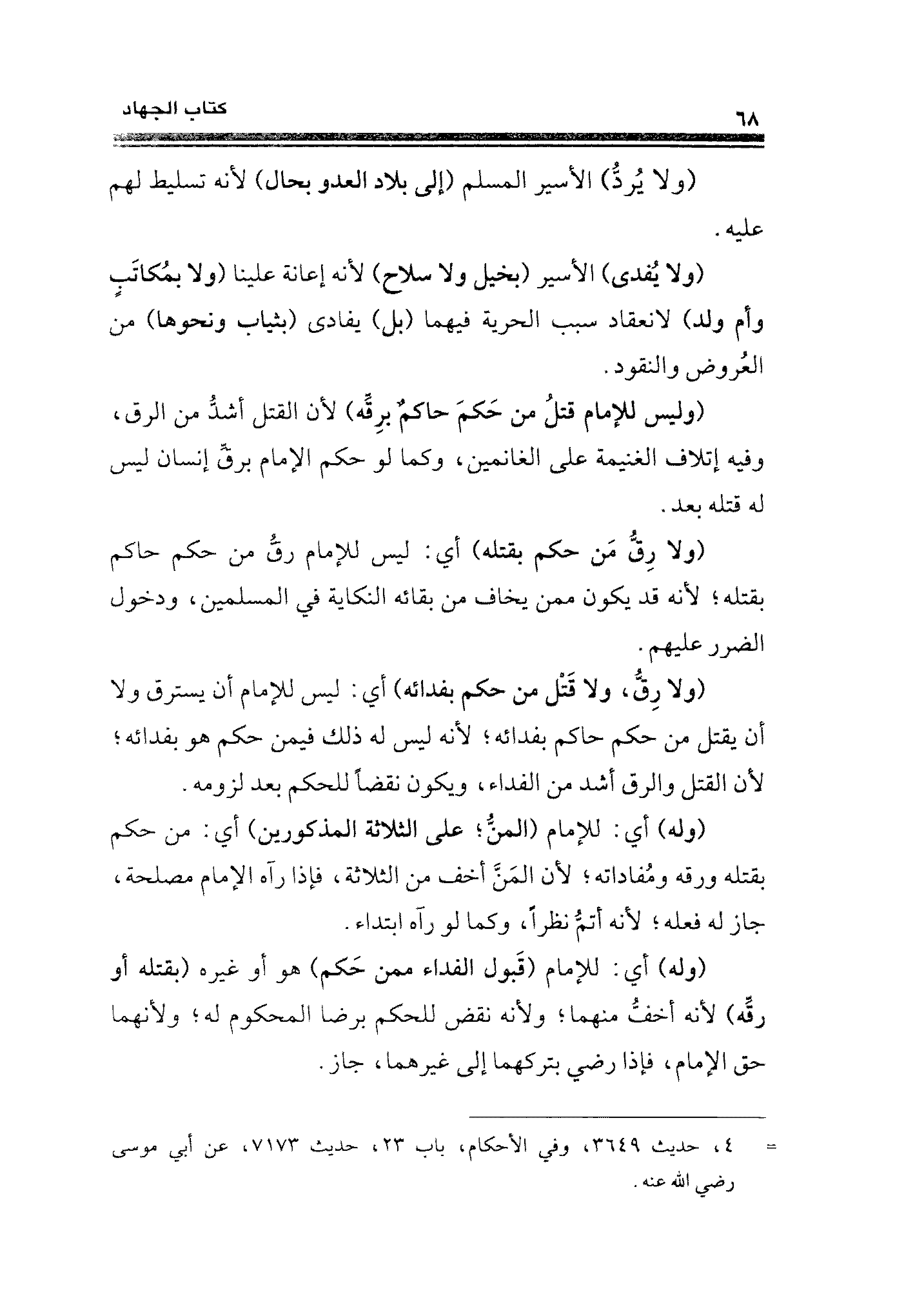 (ولا رِقُّ، ولا قَتْل من حكم بفدائه) أي: ليس للإمام أن يسترق ولا أن يقتل من حكم حاكم بفدائه؛ لأنه ليس له ذلك فيمن حكم هو بفدائه؛ لأن القتل والرق أشد من الفداء، ويكون نقضًا للحكم بعد لزومه.