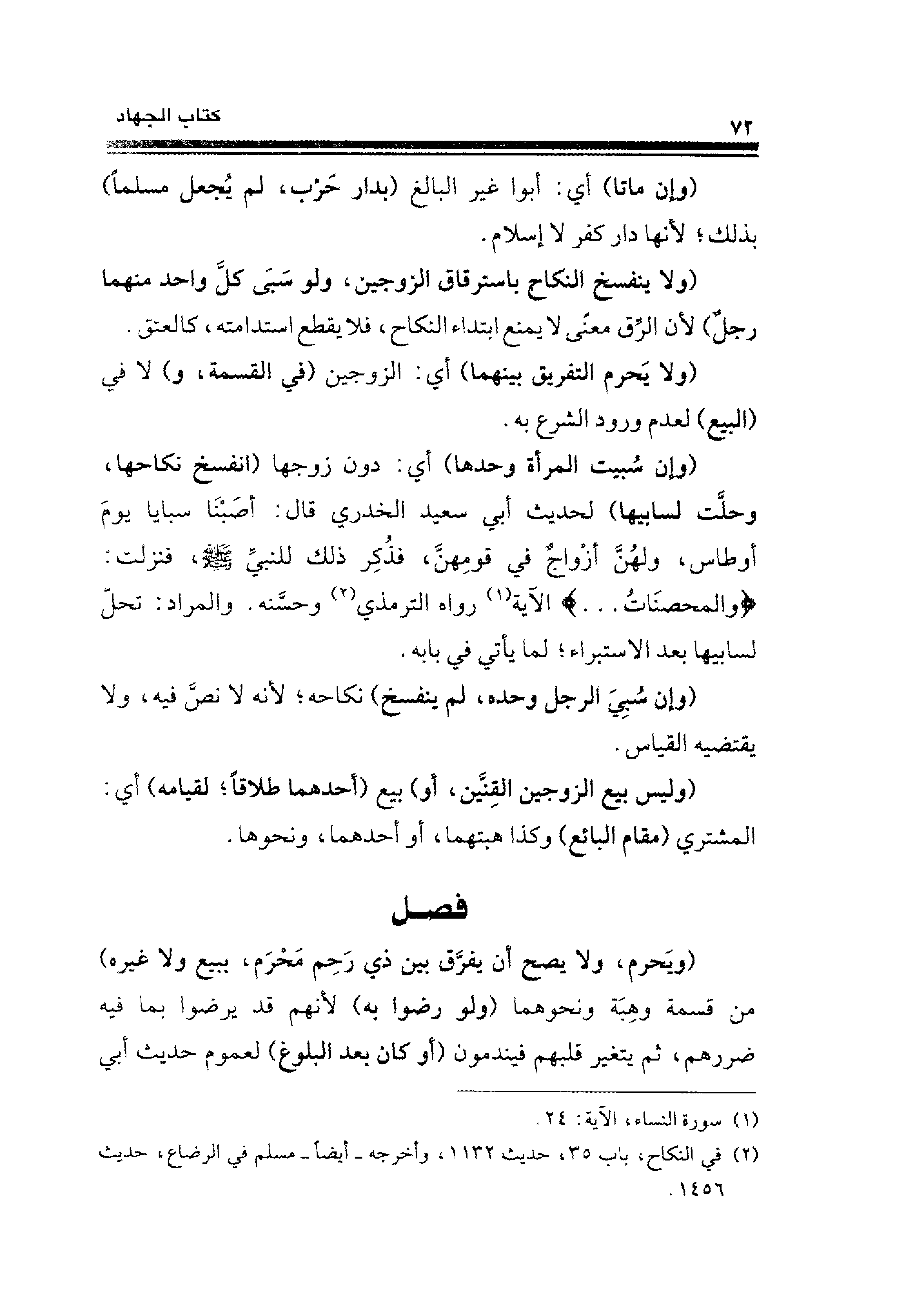 (وإن سُبيت المرأة وحدها) أي: دون زوجها (انفسخ نكاحها، وحلَّت لسابيها) لحديث أبي سعيد الخدري قال: أصَبْنَا سبايا يومَ أوطاس، ولهُنَّ أزْواجٌ في قومِهنَّ، فذُكِر ذلك للنبيِّ - صلى الله عليه وسلم -، فنزلت: {وَالْمُحْصَنَاتُ ... } الآية (¬١) رواه الترمذي (¬٢) وحسَّنه. والمراد: تحلّ لسابيها بعد الاستبراء؛ لما يأتي في بابه.
