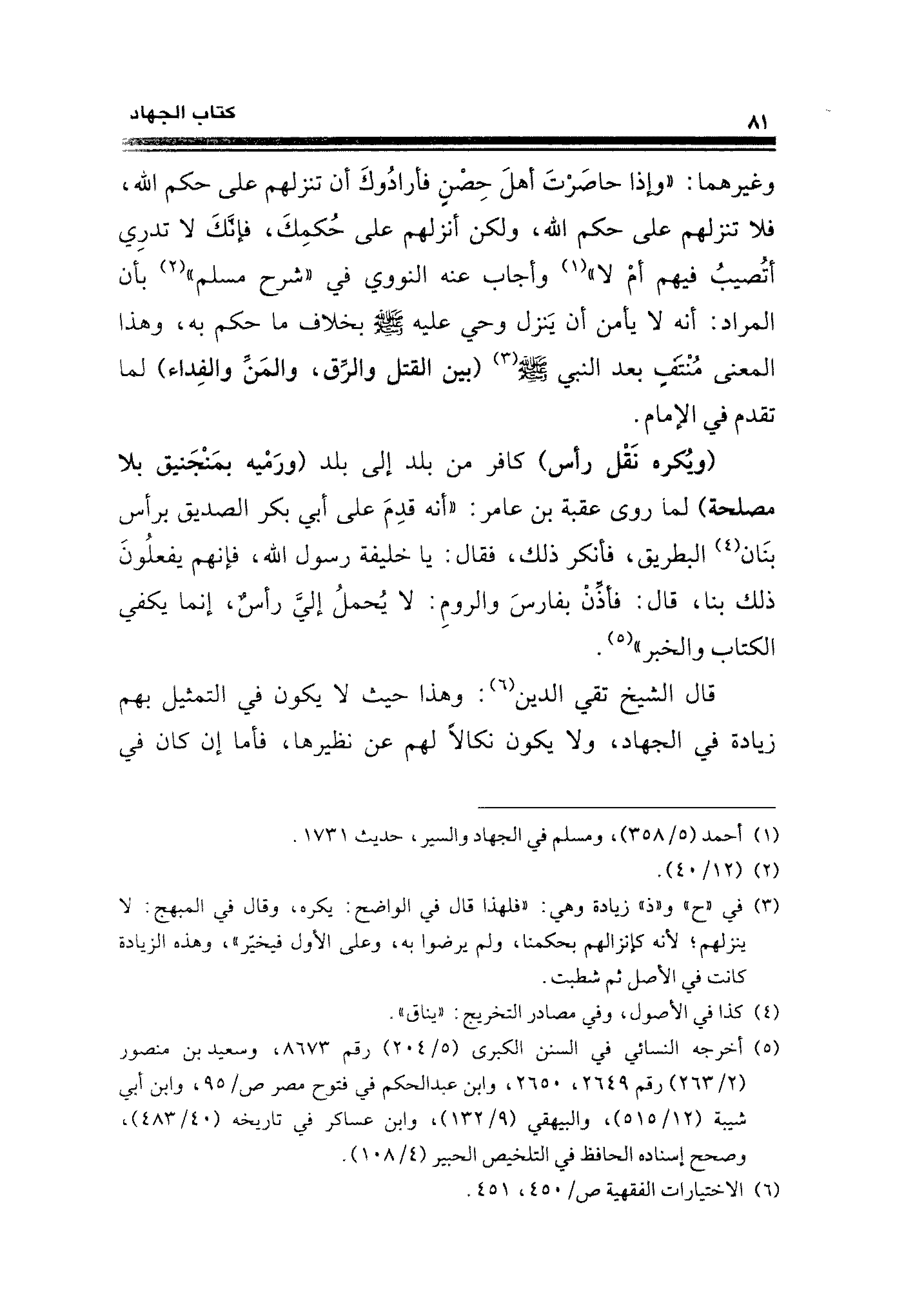 (ويُكره نَقْل رأس) كافر من بلد إلى بلد (ورَمْيه بمَنْجَنيق بلا مصلحة) لما روى عقبة بن عامر: "أنه قدِمَ على أبي بكر الصديق برأس بنَان (¬٤) البطريق، فأنكر ذلك، فقال: يا خليفة رسول الله، فإنهم يفعلُونَ ذلك بنا، قال: فأذِّنْ بفارسَ والرومِ: لا يُحملُ إليَّ رأسٌ، إنما يكفي الكتاب والخبر" (¬٥).