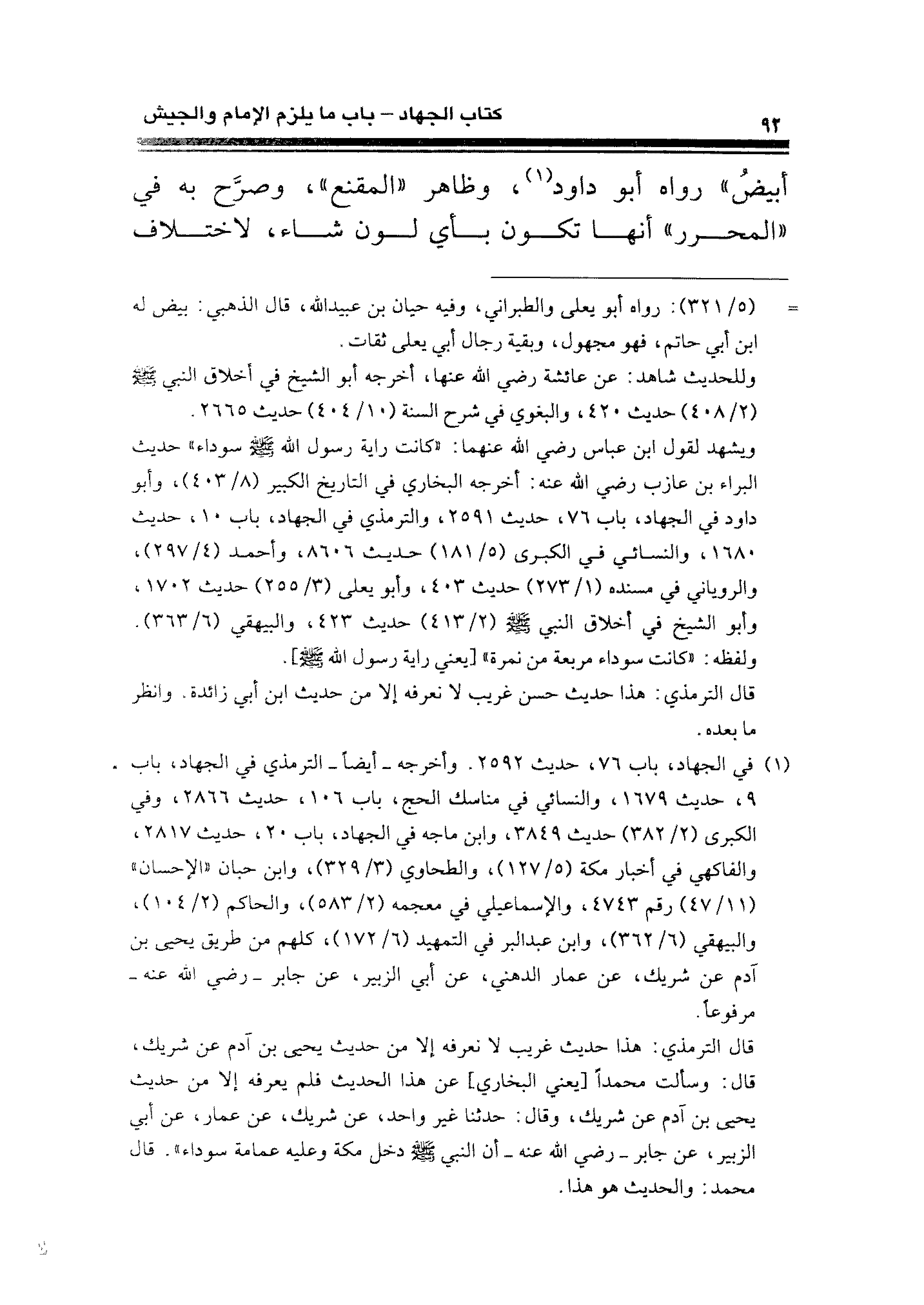ويشهد لقول ابن عباس رضي الله عنهما: "كانت راية رسول الله -صلى الله عليه وسلم- سوداء "حديث البراء بن عازب رضي الله عنه: أخرجه البخاري في التاريخ الكبير (٨/ ٤٠٣)، وأبو داود في الجهاد، باب ٧٦، حديث ٢٥٩١، والترمذي في الجهاد، باب ١٠، حديث ١٦٨٠، والنسائي في الكبرى (٥/ ١٨١) حديث ٨٦٠٦، وأحمد (٤/ ٢٩٧)، والروياني في مسنده (١/ ٢٧٣) حديث ٤٠٣، وأبو يعلى (٣/ ٢٥٥) حديث ١٧٠٢، وأبو الشيخ في أخلاق النبي -صلى الله عليه وسلم- (٢/ ٤١٣) حديث ٤٢٣، والبيهقي (٦/ ٣٦٣). ولفظه: "كانت سوداء مربعة من نمرة" [يعني راية رسول الله -صلى الله عليه وسلم-].