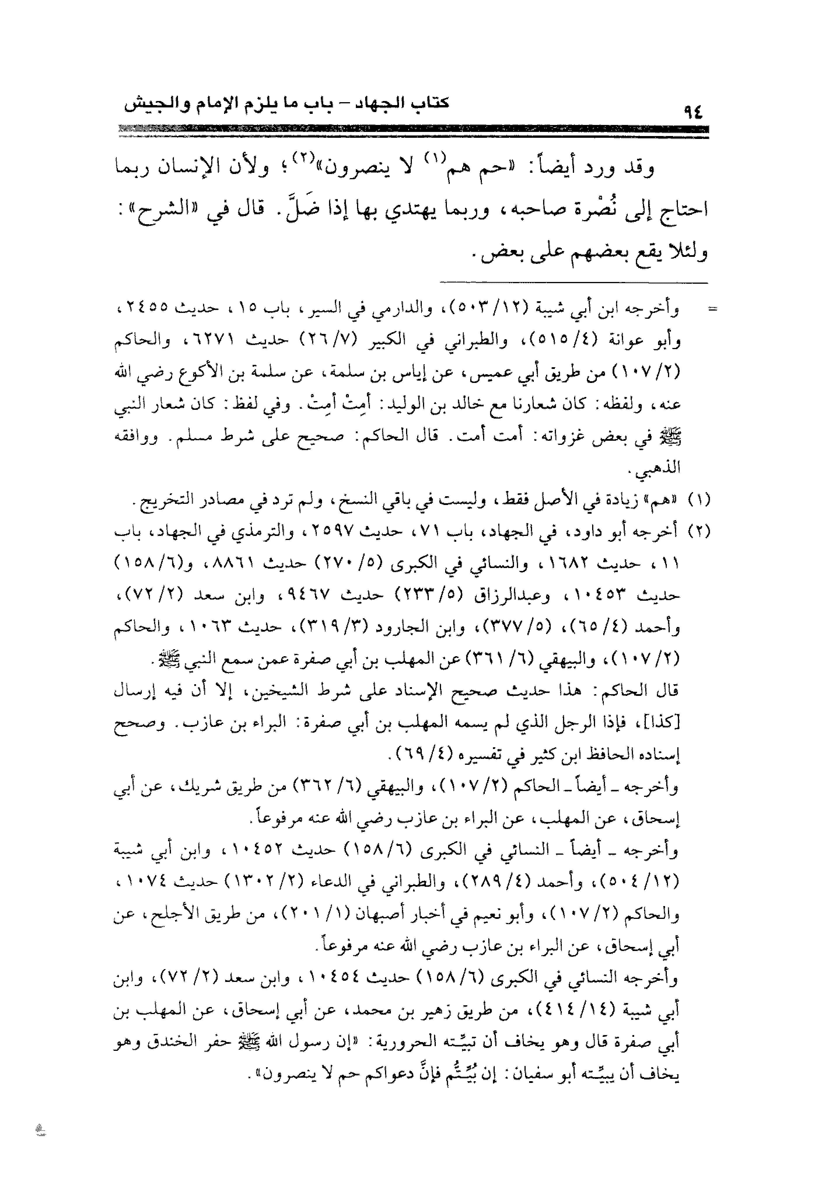 (¬٢) أخرجه أبو داود، في الجهاد، باب ٧١، حديث ٢٥٩٧، والترمذي في الجهاد، باب ١١، حديث ١٦٨٣، والنسائي في الكبرى (٥/ ٢٧٠) حديث ٨٨٦١، و (٦/ ١٥٨) حديث ١٠٤٥٣، وعبد الرزاق (٥/ ٢٣٣) حديث ٩٤٦٧، وابن سعد (٢/ ٧٢)، وأحمد (٤/ ٦٥)، (٥/ ٣٧٧)، وابن الجارود (٣/ ٣١٩)، حديث ١٠٦٣، والحاكم (٢/ ٥٧)، والبيهقي (٦/ ٣٦١) عن المهلب بن أبى صفرة عمن سمع النبي - صلى الله عليه وسلم -.