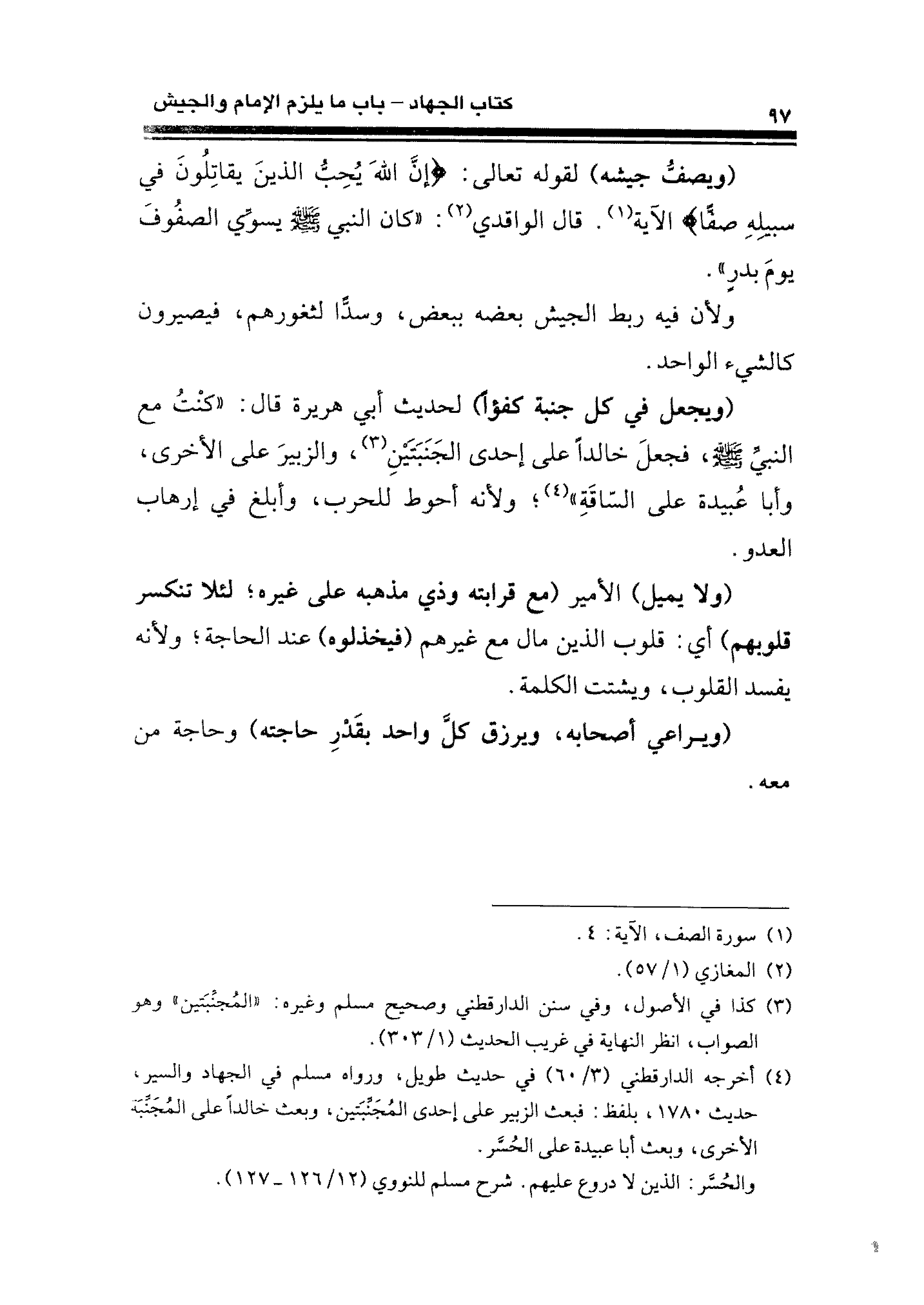 (ويجعل في كل جنبة كفؤًا) لحديث أبي هريرة قال: "كنْتُ مع النبى - صلى الله عليه وسلم -، فجعلَ خالدًا على إحدى الجَنَبَتَينِ (¬٣)، والزبيرَ على الأخرى، وأبا عُبيدة على الساقَةِ" (¬٤)؛ ولأنه أحوط للحرب، وأبلغ في إرهاب العدو.