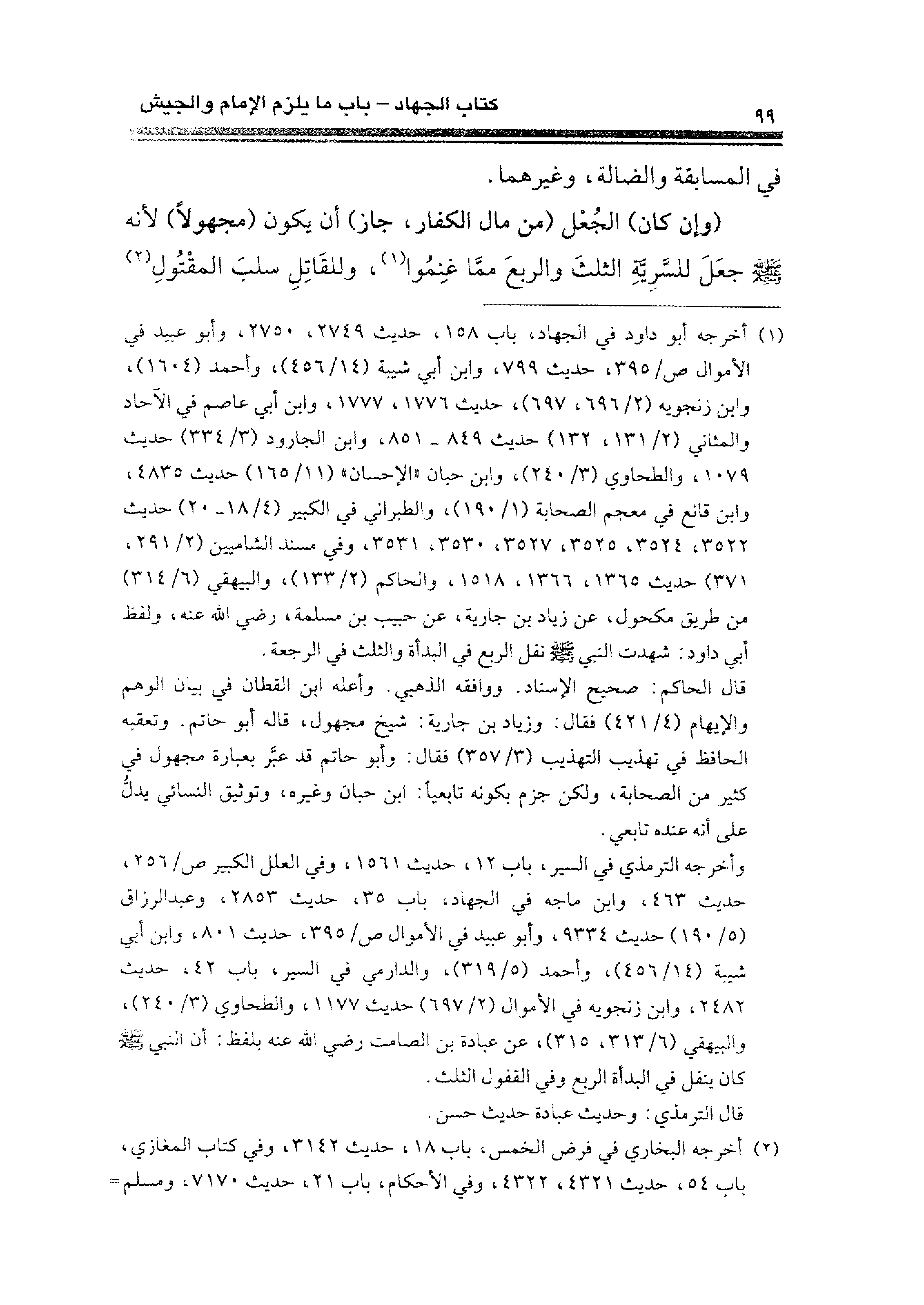 (¬١) أخرجه أبو داود في الجهاد، باب ١٥٨، حديث ٢٧٤٩، ٢٧٥٠، وأبو عبيد في الأموال ص/ ٣٩٥، حديث ٧٩٩، وابن أبي شيبة (١٤/ ٤٥٦)، وأحمد (١٦٠٤)، وابن زنجويه (٢/ ٦٩٦، ٦٩٧)، حديث ١٧٧٦، ١٧٧٧، وابن أبي عاصم في الآحاد والمثاني (٢/ ١٣١، ١٣٢) حديث ٨٤٩ - ٨٥١، وابن الجارود (٣/ ٣٣٤) حديث ١٠٧٩، والطحاوي (٣/ ٢٤٠)، وابن حبان "الإحسان" (١/ ١٦٥) حديث ٤٨٣٥، وابن قانع في معجم الصحابة (١/ ١٩٠)، والطبراني في الكبير (٤/ ١٨ - ٢٠) حديث ٣٥٢٢، ٣٥٢٤، ٣٥٢٥، ٣٥٢٧، ٣٥٣٠، ٣٩٣١، وفي مسند الشاميين (٢/ ٢٩١، ٣٧١) حديث ١٣٦٥، ١٣٦٦، ١٥١٨، والحاكم (٢/ ١٣٣)، والبيهقي (٦/ ٣١٤) من طربق مكحول، عن زياد بن جارية، عن حبيب بن مسلمة، رضي الله عنه، ولفظ أبي داود: شهدت النبي نفل الربع في البدأة والثلث في الرجعة.